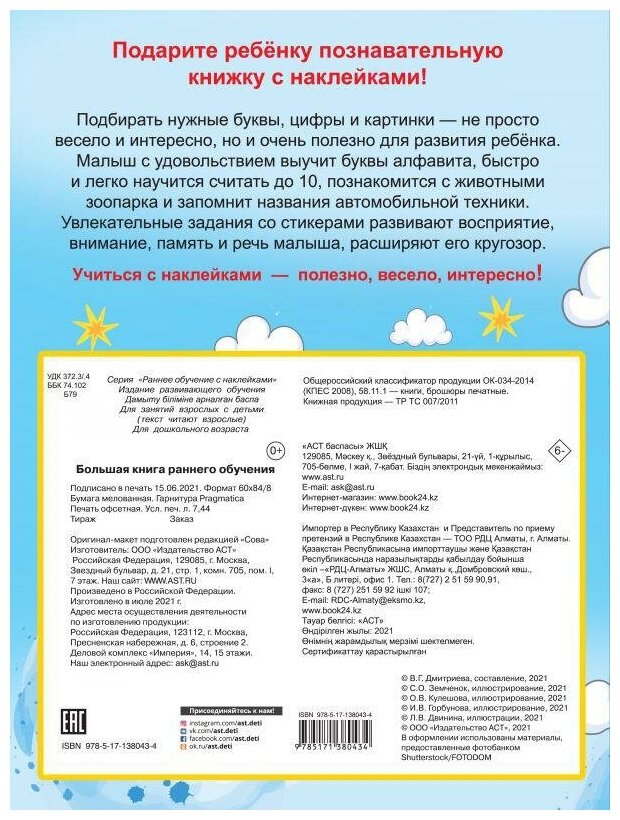 Большая книга раннего обучения с наклейками (Дмитриева Валентина Геннадьевна); Сова. Малыш (Обучающая и развивающая литература), 2021