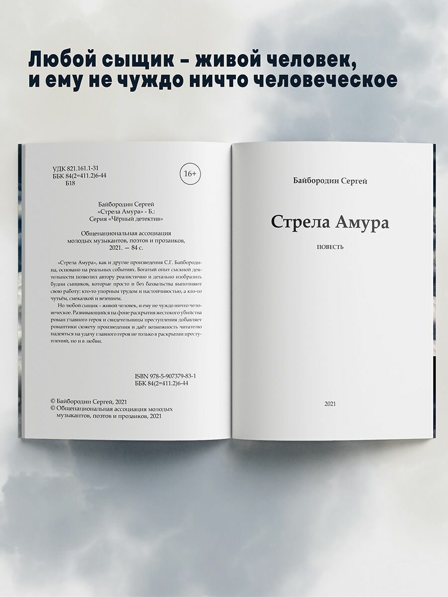 «Стрела Амура», как и другие произведения С.Г. Байбородина, основано на реальных событиях. Богатый опыт сыскной деятельности позволил автору реалистично и детально изобразить будни сыщиков, которые просто и без бахвальства выполняют свою работу: кто-то упорным трудом и настойчивостью, а кто-то чутьём, смекалкой и везением.