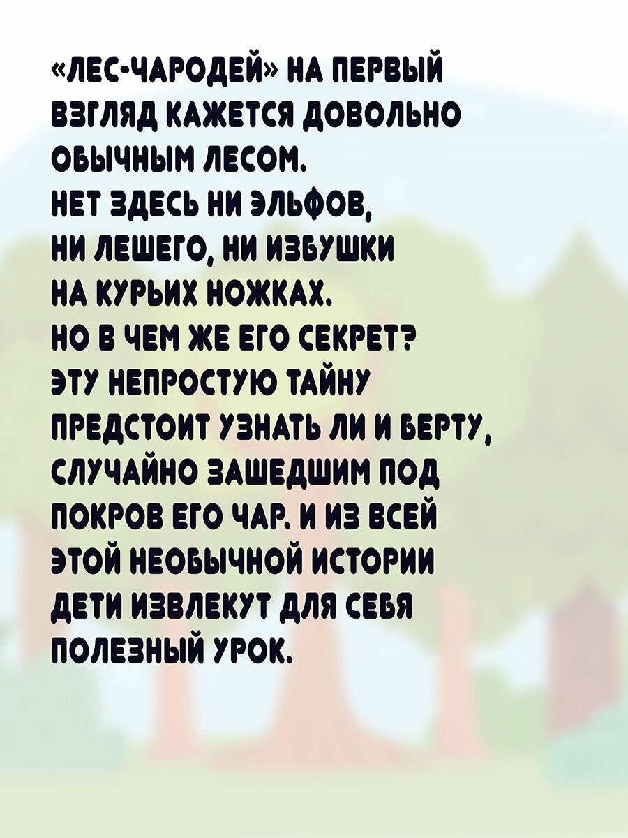 «Лес-Чародей» на первый взгляд кажется довольно обычным лесом. Нет здесь ни эльфов, ни лешего, ни избушки на курьих ножках. Но в чем же его секрет? Эту непростую тайну предстоит узнать Ли и Берту, случайно зашедшим под покров его чар. И из всей этой необычной истории дети извлекут для себя полезный урок.