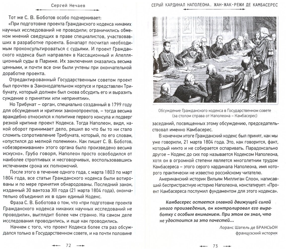Сергей Нечаев продолжил окучивание наполеоновской нивы. В предыдущих книгах он, казалось бы, со всех точек зрения и под разными углами уже рассмотрел эту великую и многогранную натуру. В этой добрался до его «серого кардинала» и подлинного творца наполеоновского Кодекса. И это очень хорошо, потому как у нас про этого человека, кстати русофила, очень мало что написано. Как всегда: профессионально и квалифицировано.