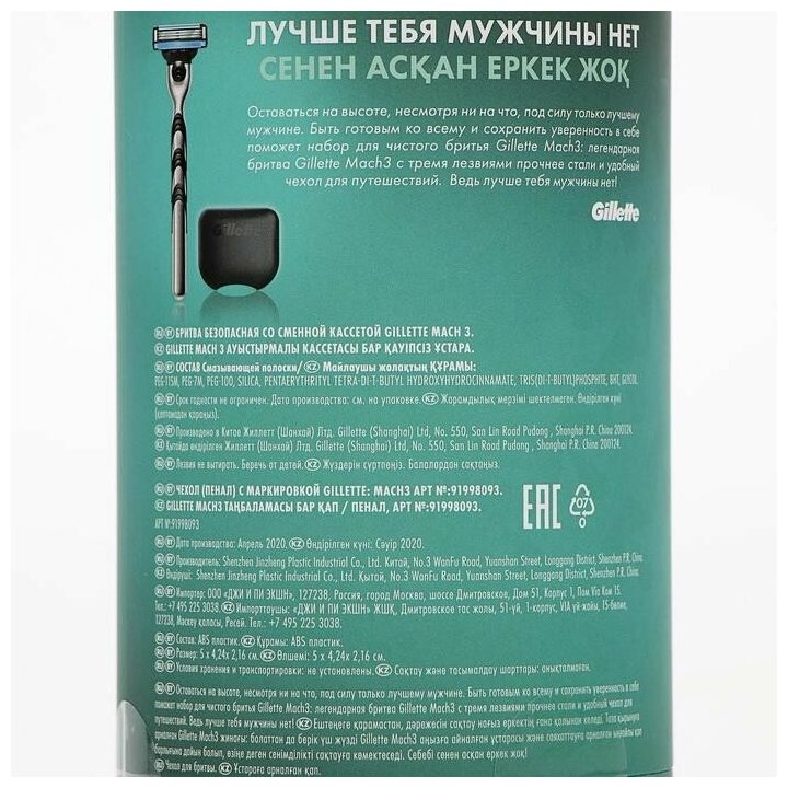 Оставаться на высоте, несмотря ни на что, под силу только лучшему мужчине. Быть готовым ко всему и сохранить уверенность в себе поможет набор для чистого бритья Gillette Mach3: легендарная бритва Gillette Mach3 с тремя лезвиями прочнее стали и удобный чехол для путешествий.