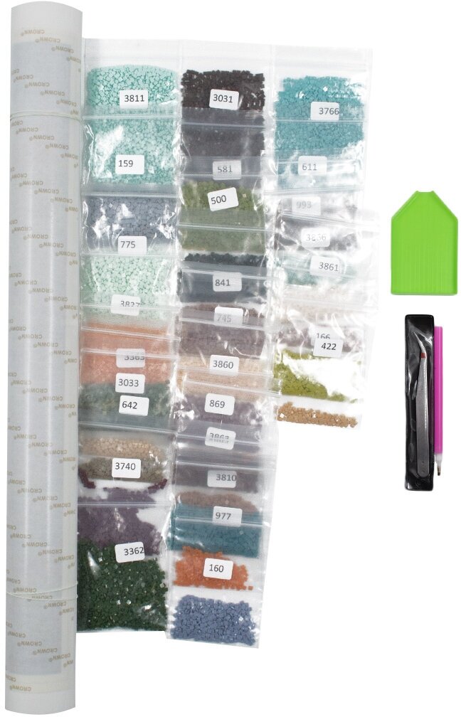 | В набор входит | Холст с клеевым слоем и условными обозначениями (схема), акриловые клеевые стразы 2,5*2,5 мм - 27 цветов, стилус, пинцет, контейнер для страз прямоугольный, силикон, инструкция. |