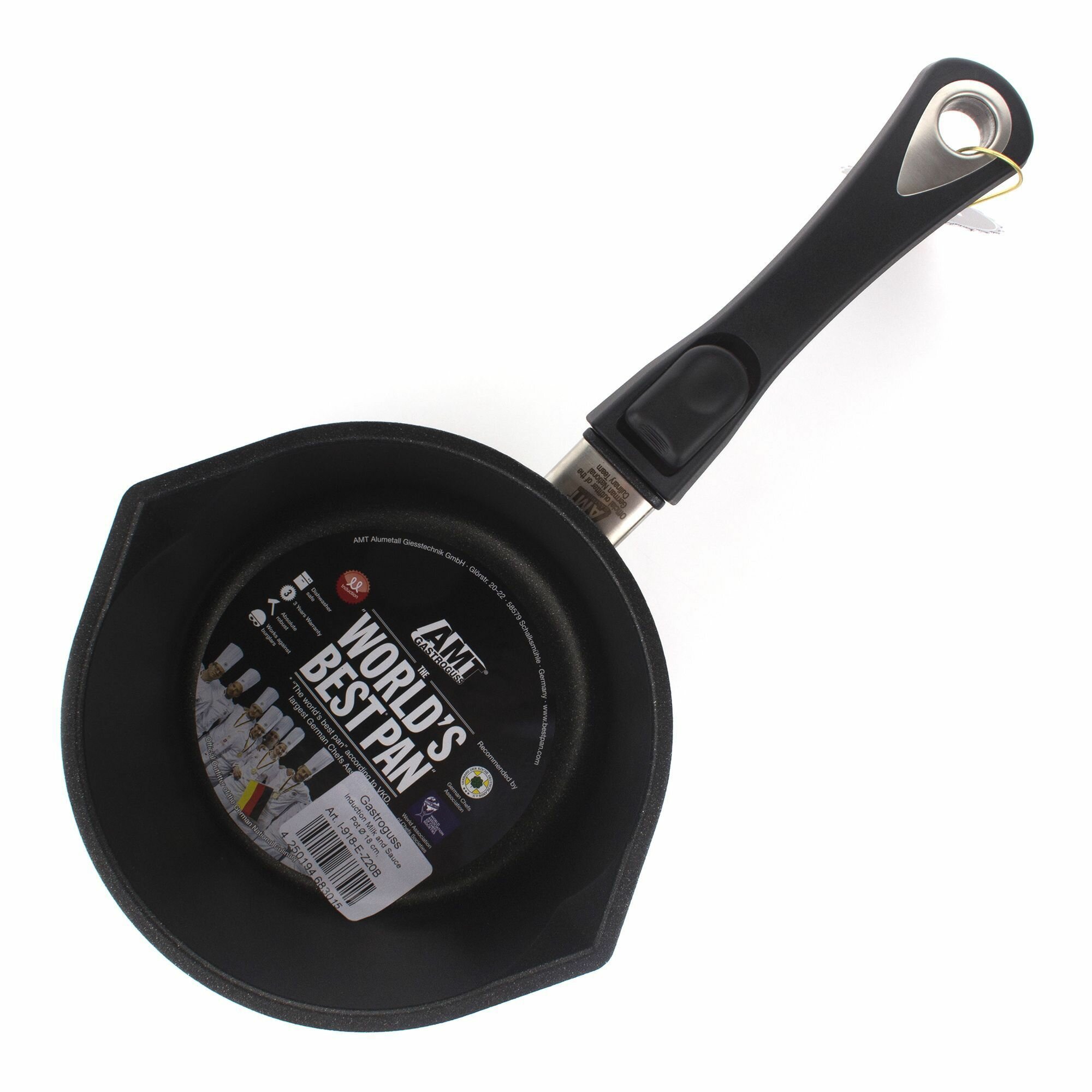 Ковш AMT из литого алюминия позволяет готовить пищу практически без масла и жиров, использовать металлические предметы при приготовлении. Легко и быстро моется любыми моющими средствами, допускается мытьё в посудомоечной машине. Съемная ручка удобная в пользовании – экономит место на кухне. Толстое термоаккумулирующее дно (10 мм) способствует равномерному теплораспределению, не деформируется от высоких температур. Подходит для всех видов плит, а также для использования в духовке.