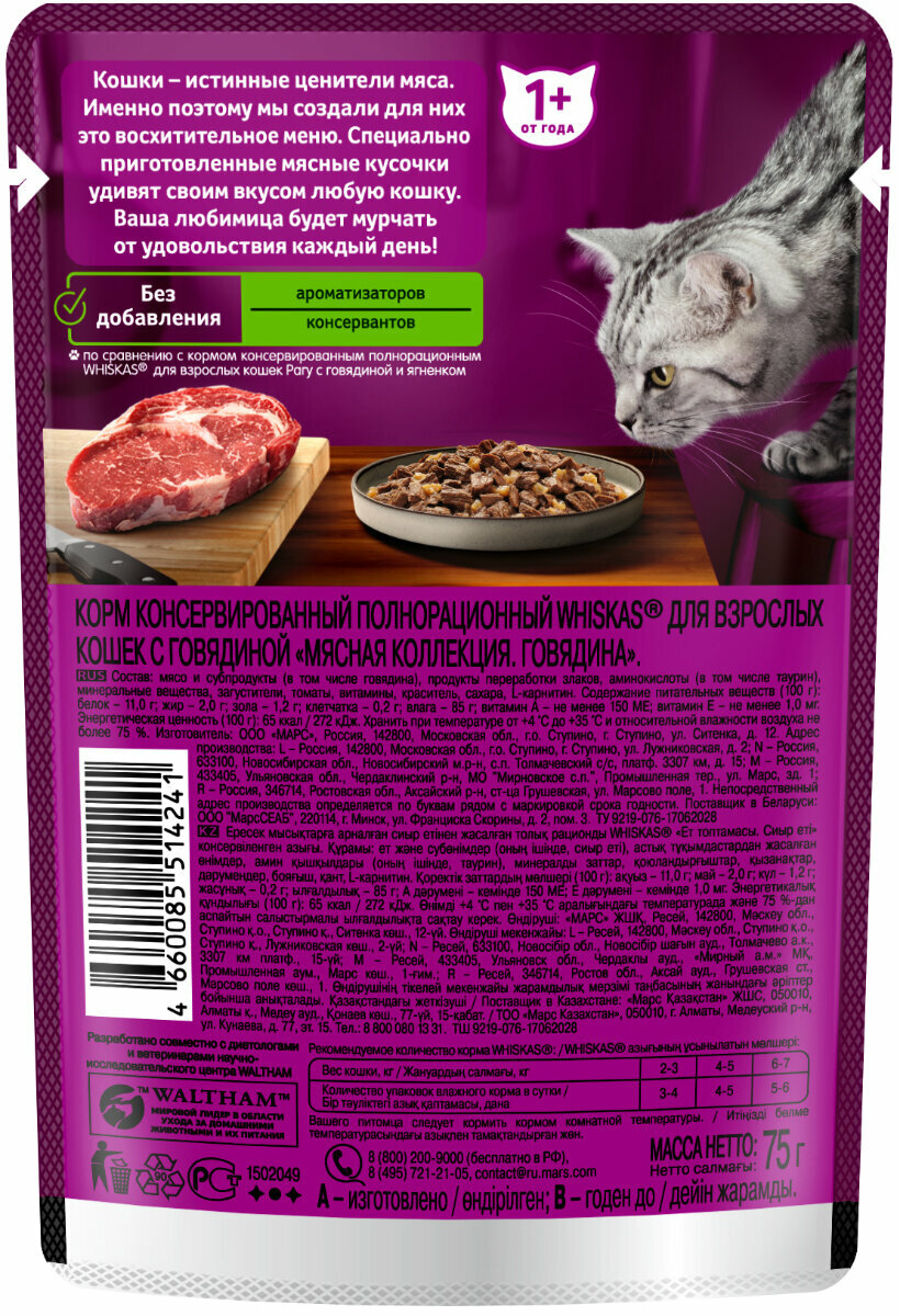 Сложно найти таких взыскательных ценителей мяса, как кошки. Именно для них мы создали новый WHISKAS Мясная коллекция для замурррчательной жизни. Это палитра мясных блюд, которые обладают особой волокнистой текстурой. Мы готовим их в нежном соусе или желе и упаковываем в паучи. Порадуйте вашу кошку сочными кусочками с говядиной и доставьте ей максимум удовольствия. Подходит для стерилизованных котов и кошек. WHISKAS для взрослых кошек это: