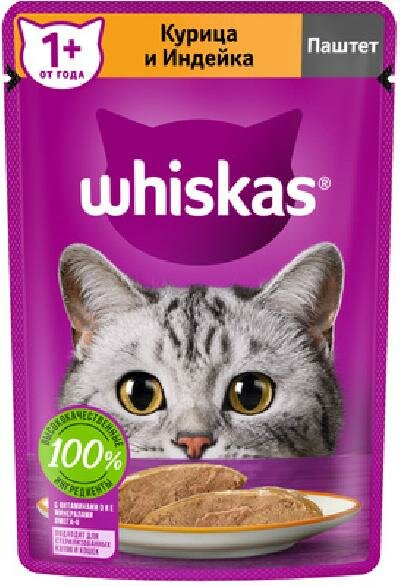 Это сбалансированный рацион, приготовленный именно так, как любит ваша кошка. Аппетитный паштет с курицей и индейкой подарит вашей любимице настоящее удовольствие. Жизнь замурррчательна, ведь рацион Whiskas содержит все необходимое, чтобы еда вашей кошки была не только вкусной, но и полезной. Whiskas поддержит иммунитет, позаботится о здоровом пищеварении и здоровье кожи и шерсти вашей кошки. Подходит для стерилизованных котов и кошек. Рационы Whiskas для взрослых кошек это: