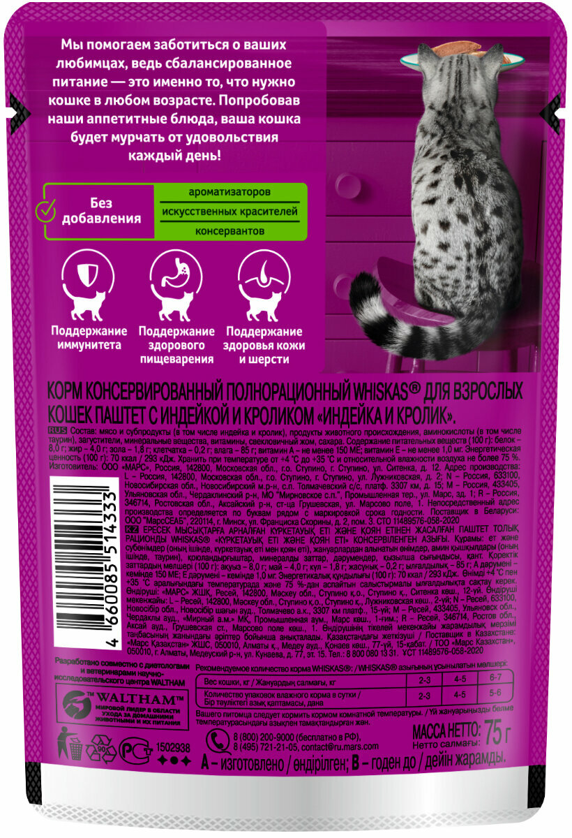 Корм для кошек Whiskas паштет с индейкой 75 гр