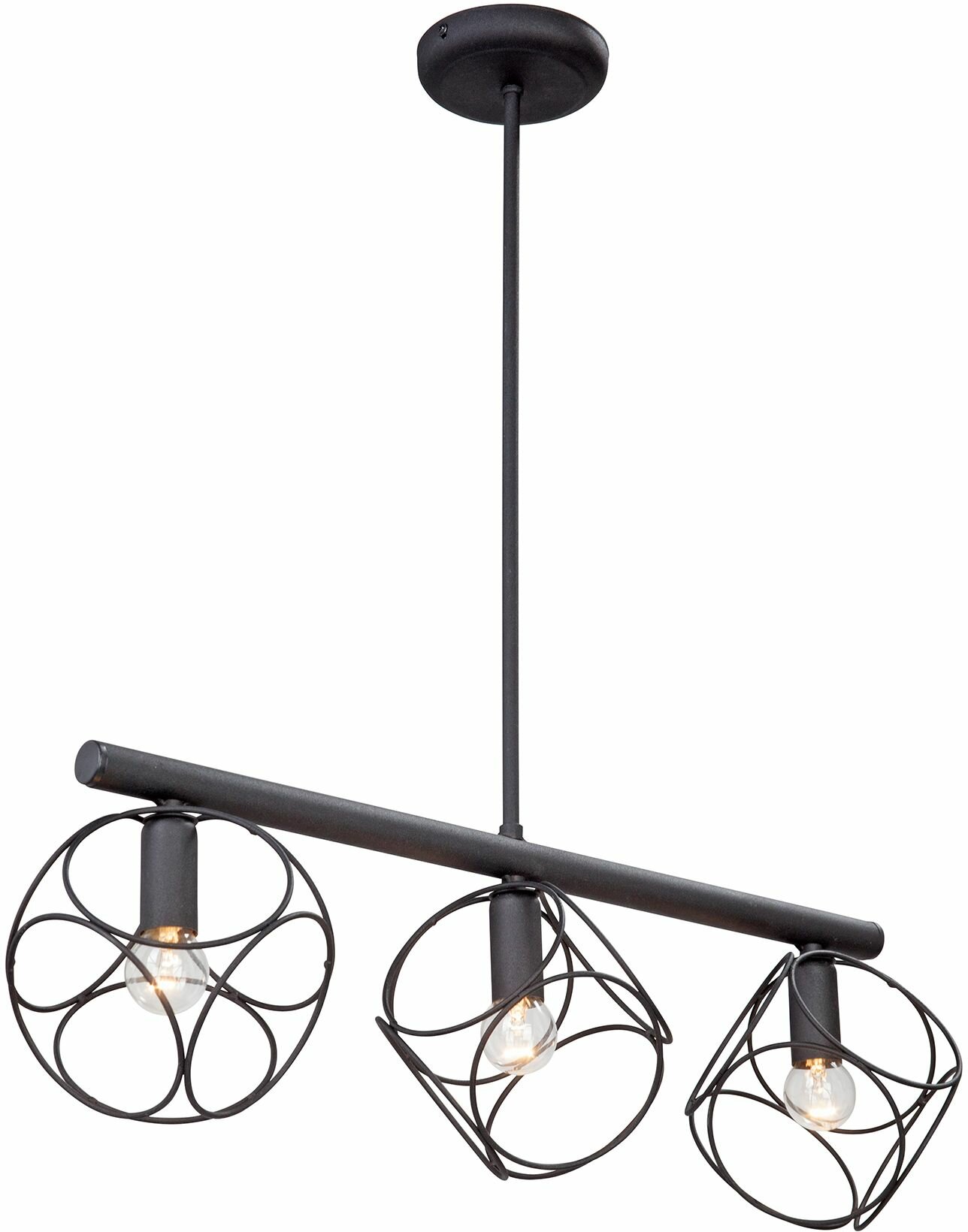 Подвес имеет металлическое основание и каркас, покрытые черной порошковой краской. Для освещения используются лампочки с цоколем Е14.
