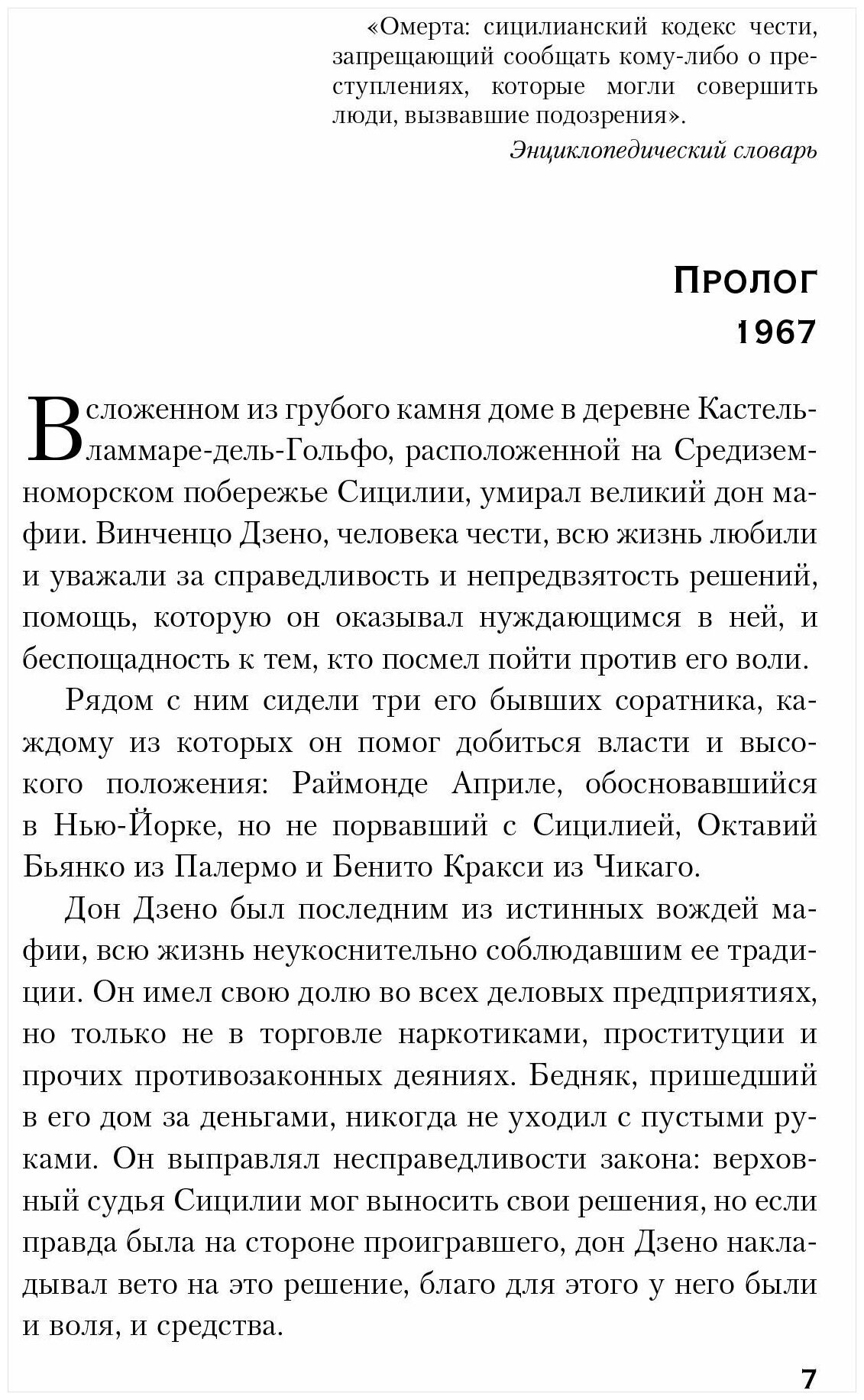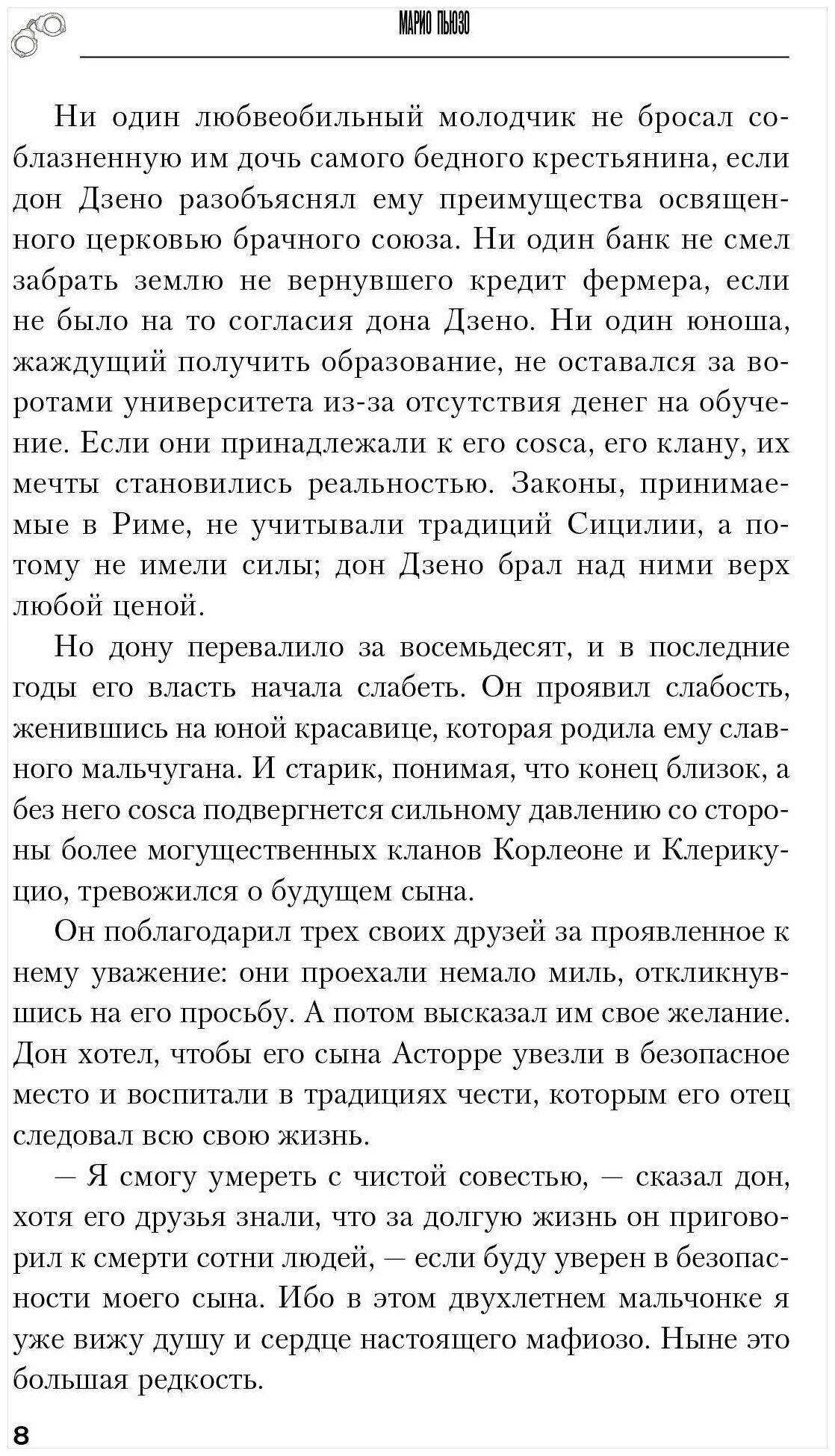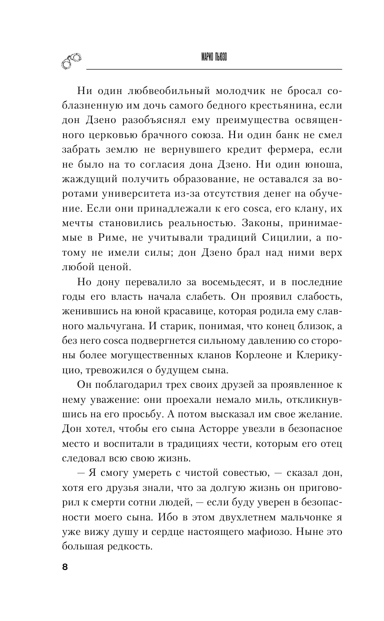 Достойное продолжение романов \"Крестный отец\" и \"Сицилиец\". Добротное произведение о \"людях чести\". Это-самостоятельное произведение, в котором собраны воедино и обобщены основные постулаты \"мафиозной философии\". Читается легко, начало чуть затянуто, но это-догма для подобного произведения. Рекомендовал бы начинать чтение в хронологическом порядке, начиная, все же, с тома \"Крестный отец\". Оформление-моя благодарность издательству (рад, что дождался произведение именно в этом издании). Рекомендую к покупке любителям жанра.