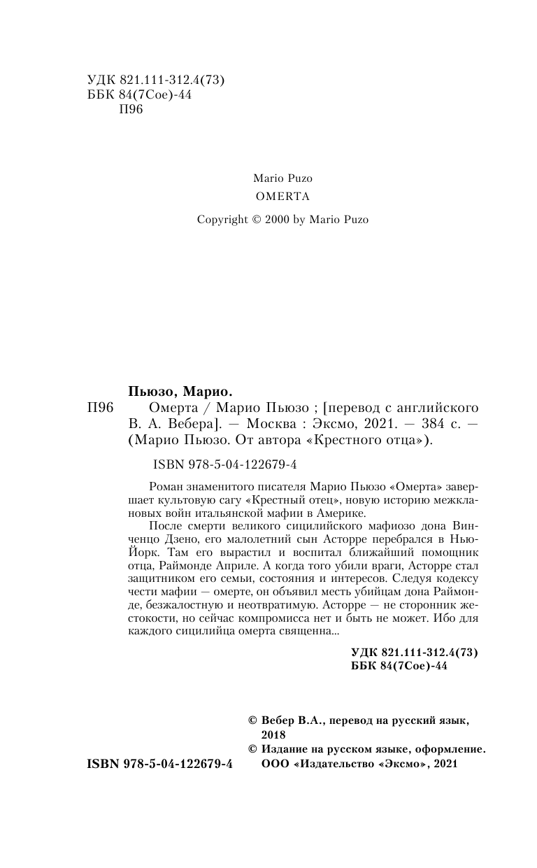 Книга: Омерта (Марио Пьюзо); Эксмо, Редакция 1, 2021
