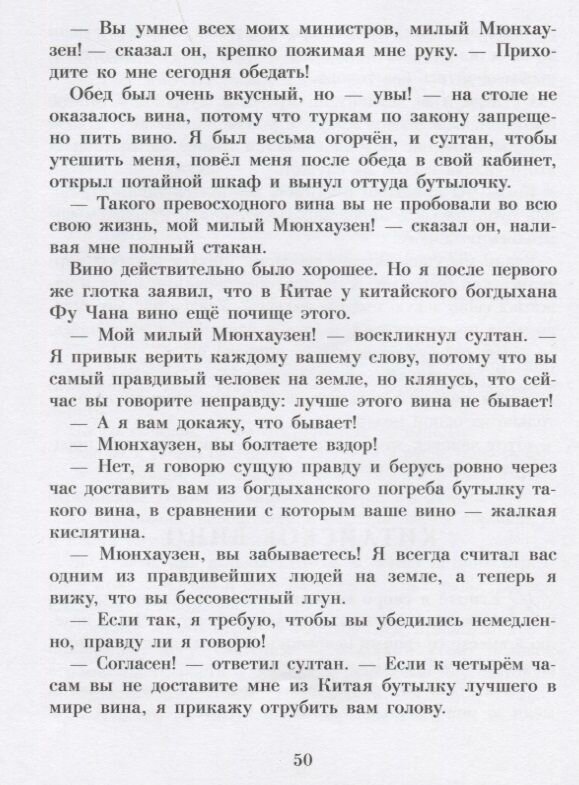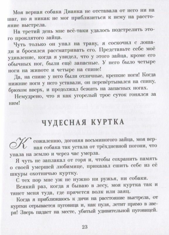 В книге вас ждет встреча с известным фантазером и выдумщиком бароном Мюнхаузеном. Он будет летать на пушечном ядре, скакать на половине коня, путешествовать на Луну, сражаться с ожившим тулупом, охотиться на белых медведей - всех приключений и не перечислишь!