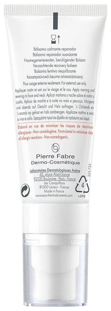 | Состав | avene aqua, caprylic/capric triglyceride, glycerin, cetearyl alcohol, butyrospermum parkii butter, squalane, cera alba, cetearyl glucoside, cetyl esters, aquaphilus dolomiae extract filtrate, arginine, citric acid, tromethamine, aqua, xanthan gum |