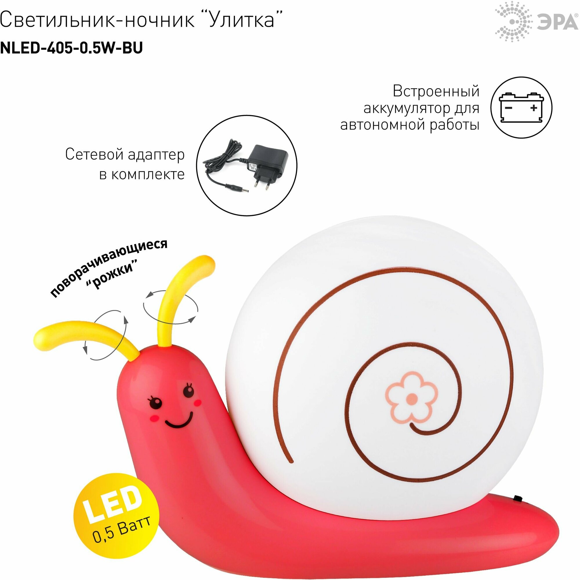 Эра Лампа настольная 0,5Вт LED Розовый Светильник-ночник ЭРА создаст уютный свет в темное время суток, поможет вашему ребенку спокойно спать, не боясь темноты. Зарядите светильник и поставьте в любое место, где он вам нужен. Чтобы перейти в другую комнату, свет включать не придется! У светильника удобная ручка, вам и ребенку будет легко его взять с собой - с таким другом в темноте не страшно. светильник светится мягким, но достаточно ярким светом. Дизайн в виде улитки с поворачивающимися "рожками".