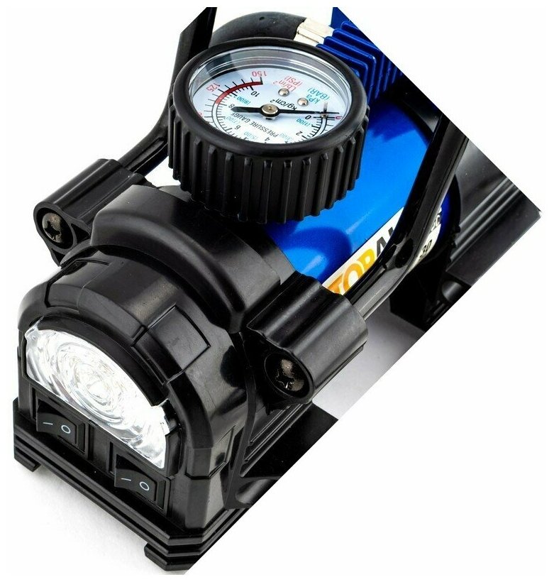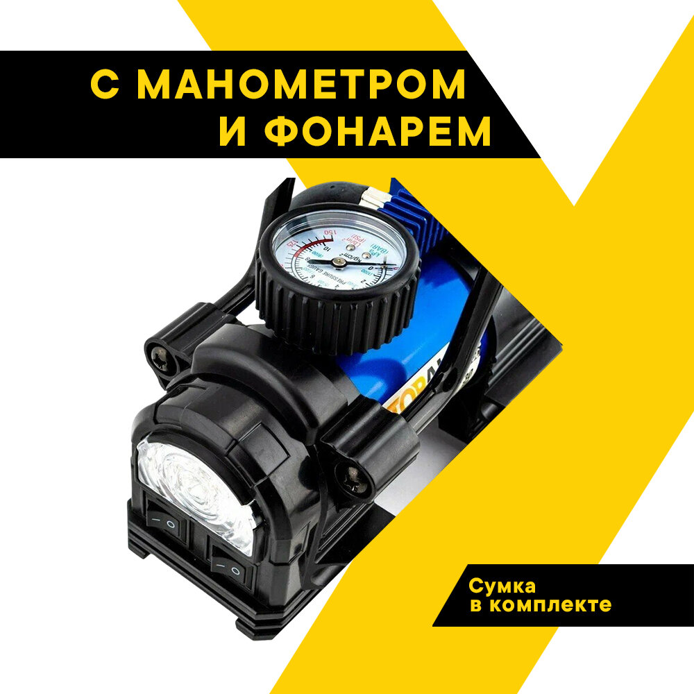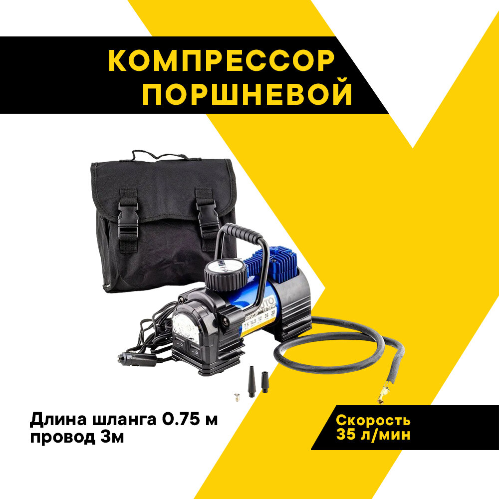 НЕ требует обслуживания, так как оснащён системой постоянной смазки двигателя! Автомобильный поршневой компрессор предназначен для накачивания воздухом шин легковых и коммерческих автомобилей, мотоциклетных и велосипедных шин, шин детских колясок, резиновых лодок, матрасов, бассейнов, надувных игрушек и спортивного инвентаря. Мощный светодиодный фонарь, 35л/мин, до 7,5/110 Атм/PSI, универсальные насадки, сумка для хранения, металлический корпус. Производительность 35 л/мин, макс. давление 7,5 ATM/ 110 PSI. Длина шланга 0,75 м. Длина провода 3 м. Светодиодный фонарь. Доп. аксессуары - сумка, 3 насадки.