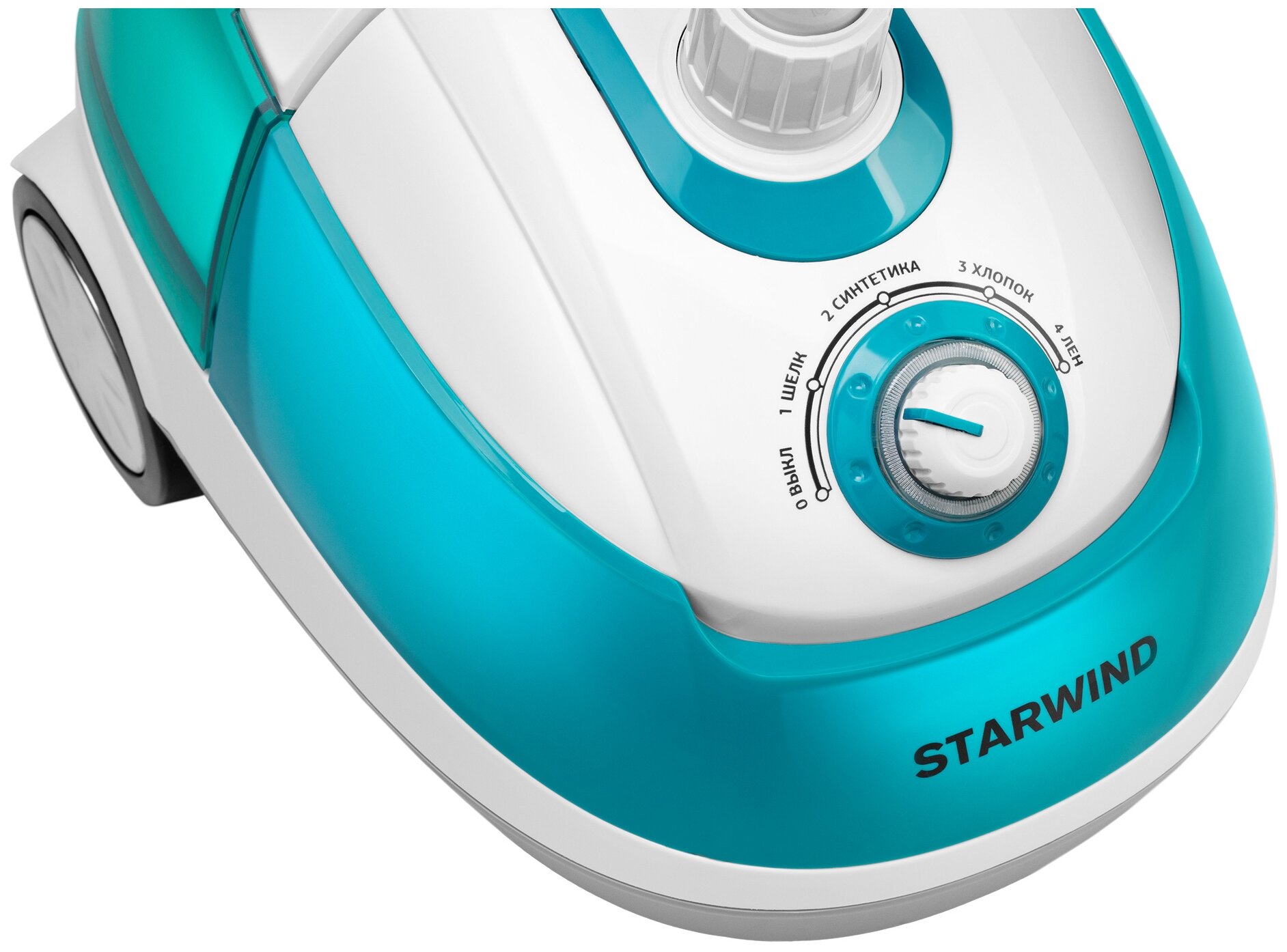 Отпариватель напольный Starwind белый/бирюзовый, мощность 1800Вт, в комплекте Насадка для стрелок и щетка 2 в 1, защитная варежка, вешалка