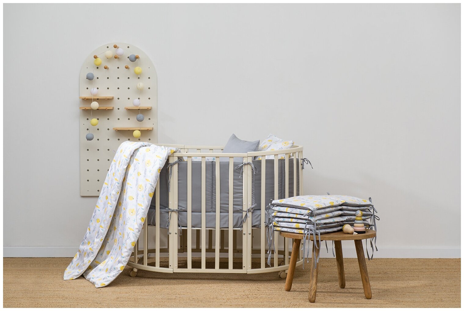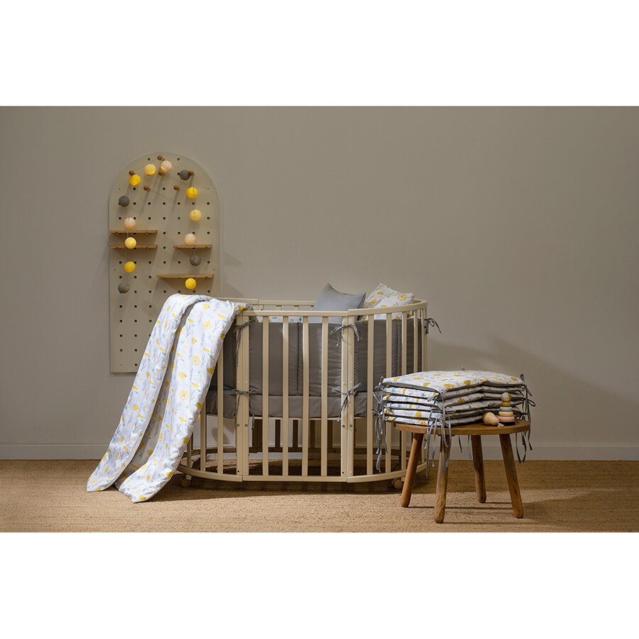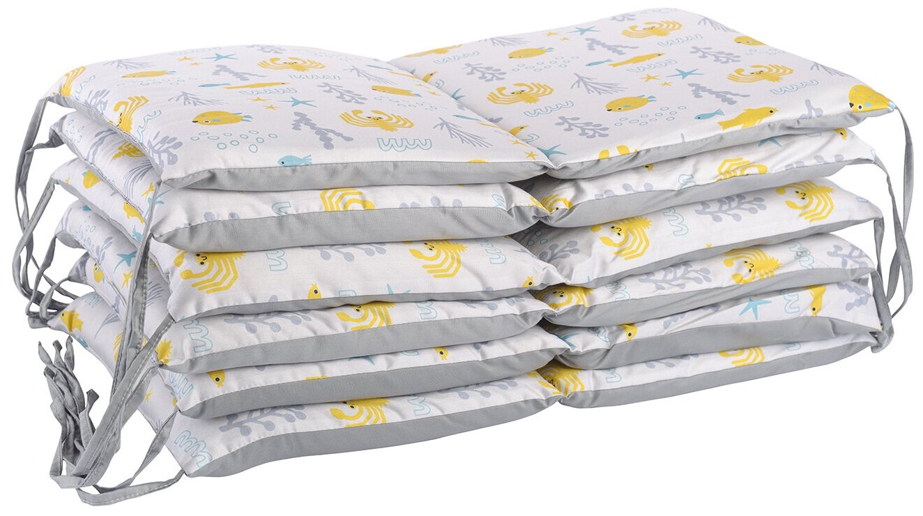 Бортик в кроватку из сатина с принтом Oceania world из коллекции Tiny world сделает первую кроватку малыша особенно уютной и безопасной: защитит от случайного сквозняка, немного приглушит внешние звуки и свет, прикроет жесткое ограждение кроватки. Принт нанесен на обе стороны бортика. Изделие подойдет для обычной и для круглой кроватки-трансформера, состоит из 6 секций по 2 «подушечки» и крепится к кроватке прочными завязками. Бортики будут сочетаться с любым постельным бельем.
