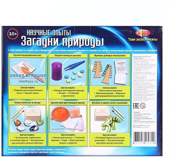| Комплектация | порошок для искусственного снега, мерная ложка, насадка для содания торнадо, пинцет, 6 таблеток с красителем, пластиковая подставка, картонное дерево,порошок для кристаллов, 5 пластиковых камешков в гипсовом бруске, пластиковый резец, кисточка, основа для вулкана, гипсовый порошок, сода, пластиковая бутылочка, трубочка, гипсовый брусок |