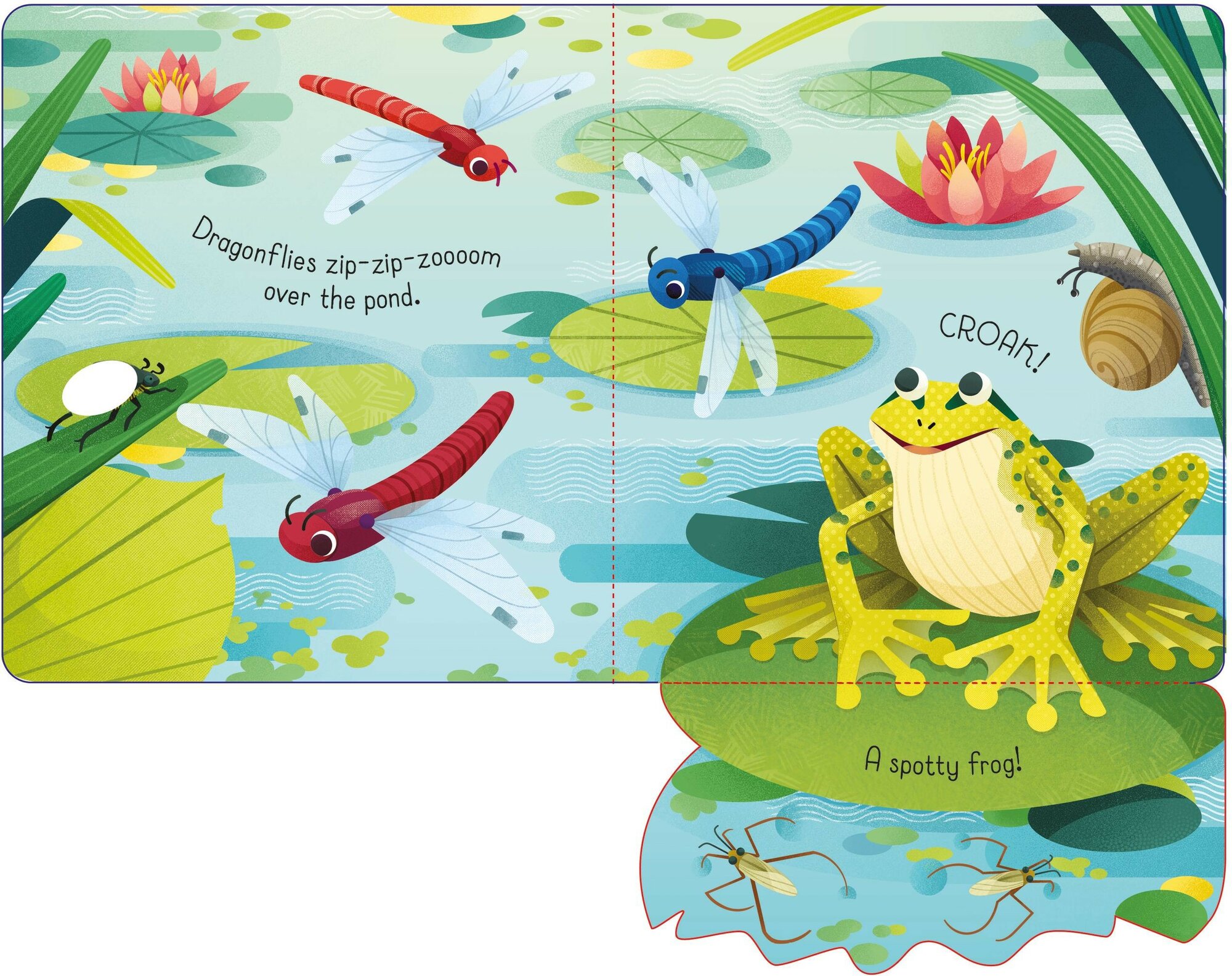 Where has the spotty frog gone now? Very little children will love lifting the flaps to find the frog and follow her around the pond to meet all the other animals. Discover a speedy fish, a hungry heron, five fluffy ducklings and lots of wiggly tadpoles, as the spotty frog hops, dives and swims around the pond.