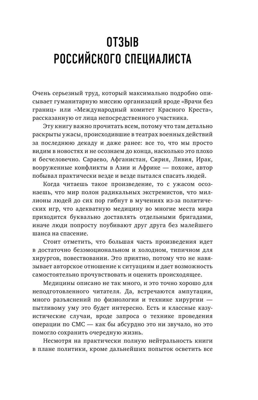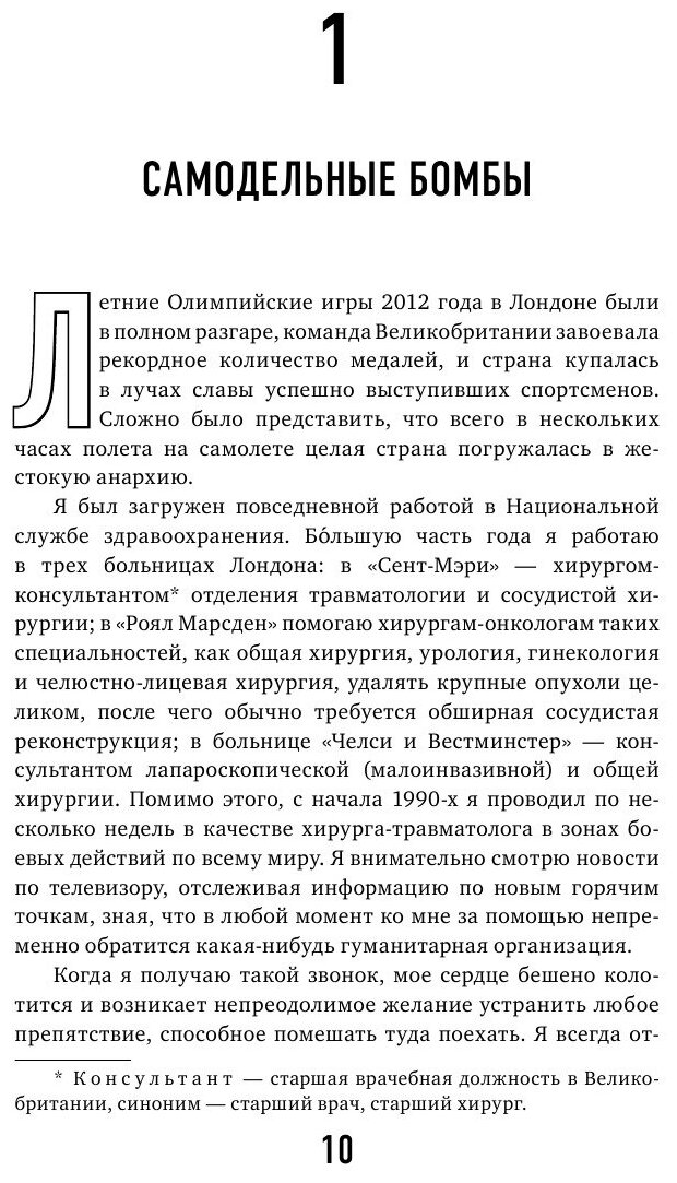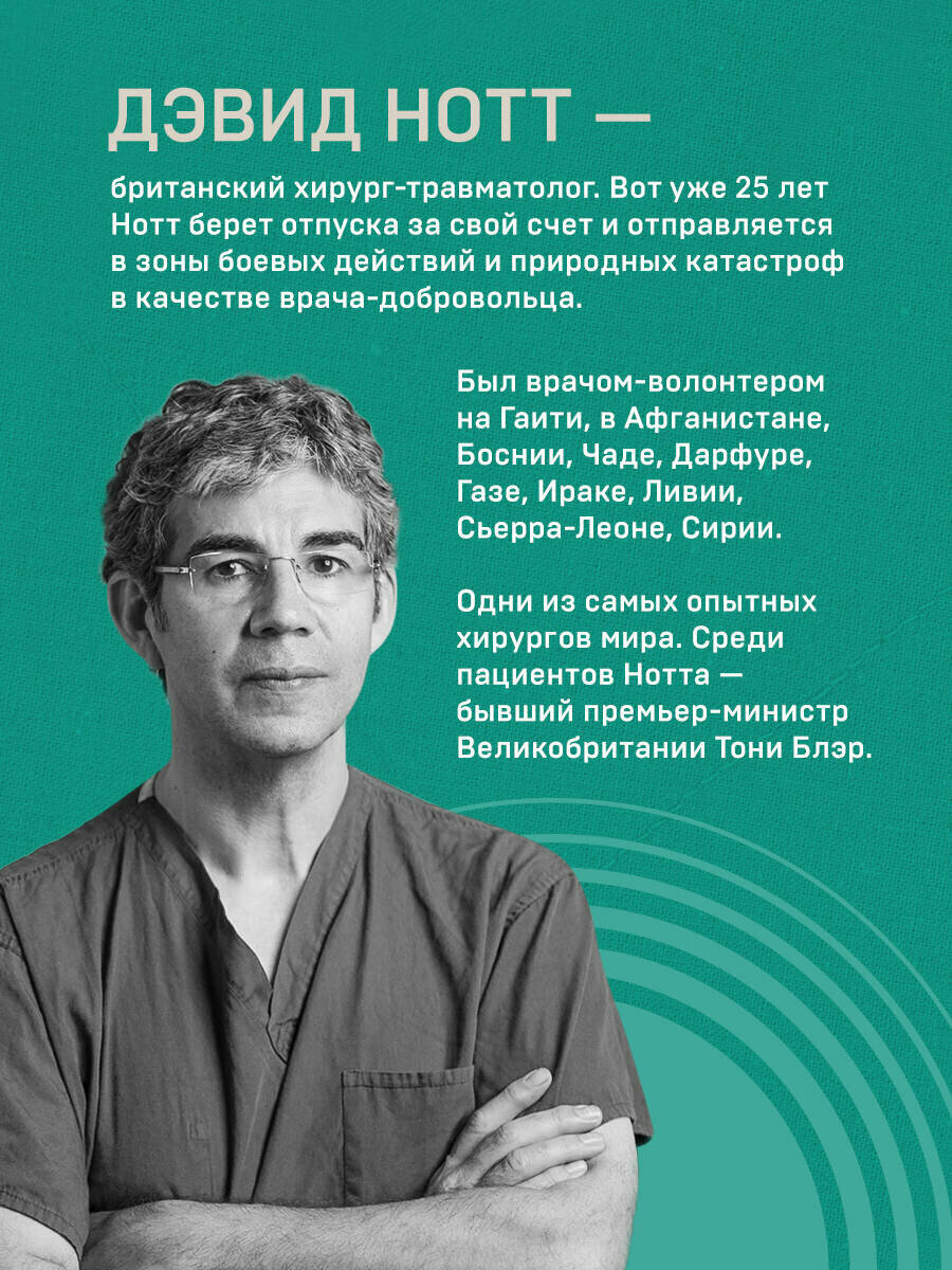 Невероятная и захватывающая книга о жизненном пути талантливого британского хирурга. Иногда он берет неоплачиваемый отпуск и едет в горячие точки — спасать людей. В книге он не только "отправляет" нас в такие места, как Афганистан, Гаити, Алеппо, Сараево, Йемен и Ливия, но и дает представление о том, как его работа там развивалась и меняла его самого и его философию.