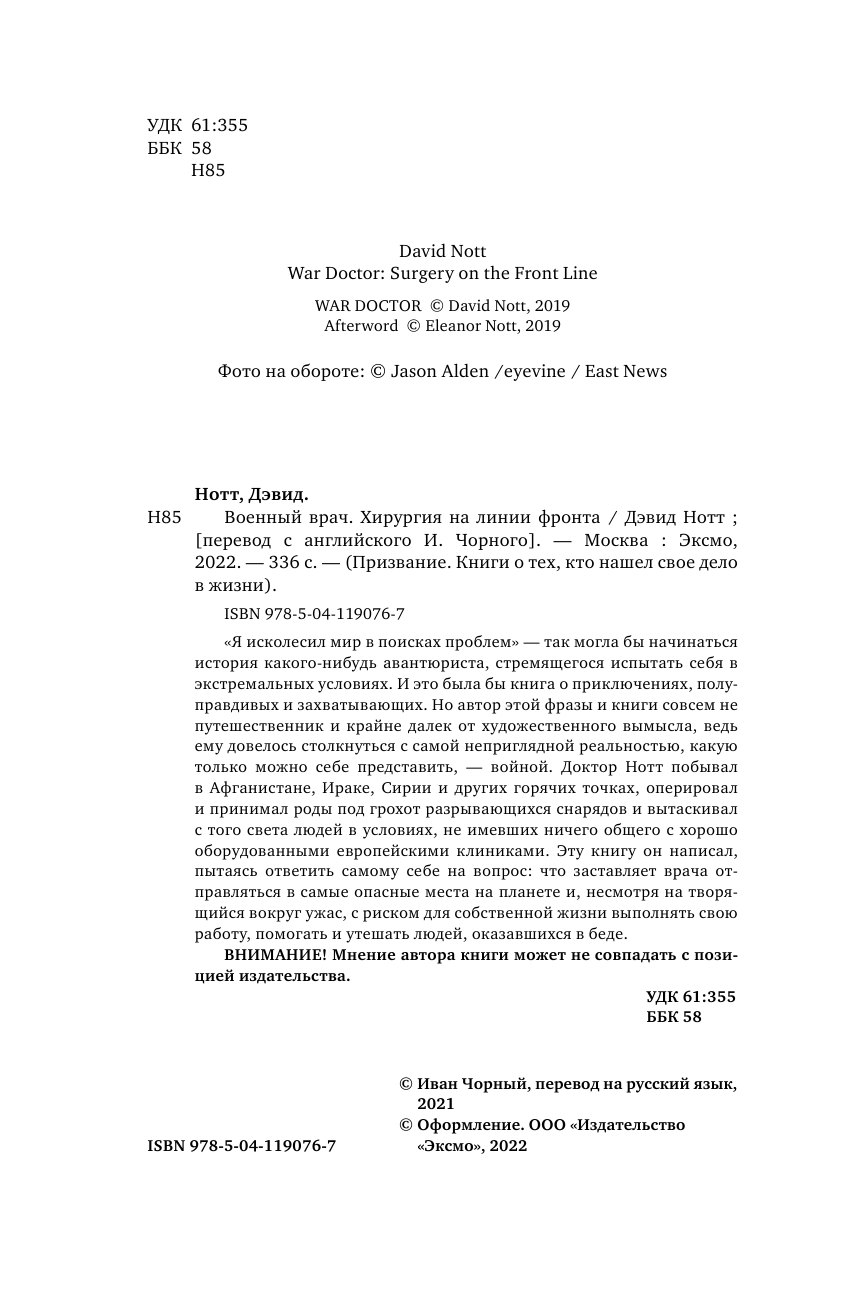 "Я исколесил мир в поисках проблем" - так могла бы начинаться история какого-нибудь авантюриста, стремящегося испытать себя в экстремальных условиях. И это была бы книга о приключениях, полуправдивых и захватывающих. Но автор этой фразы и книги совсем не путешественник и крайне далек от художественного вымысла, ведь ему довелось столкнуться с самой неприглядной реальностью, какую только можно себе представить, - войной. Доктор Нотт побывал в Афганистане, Ираке, Сирии и других горячих точках, оперировал и принимал роды под грохот разрывающихся снарядов и вытаскивал с того света людей в условиях, не имевших ничего общего с хорошо оборудованными европейскими клиниками. Эту книгу он написал, пытаясь ответить самому себе на вопрос: что заставляет врача отправляться в самые опасные места на планете и, несмотря на творящийся вокруг ужас, с риском для собственной жизни выполнять свою работу, помогать и утешать людей, оказавшихся в беде.