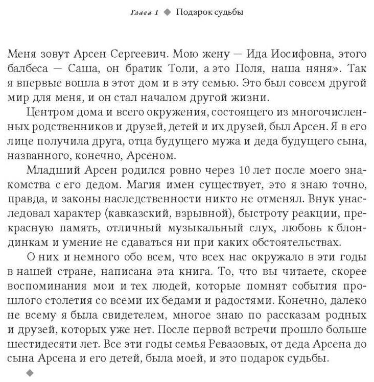 Книга понравилась, читается легко и с интересом. Мемуары о жизни нескольких поколений одной семьи в прошлом веке написаны профессором-генетиком Ю.А.Ревазовой. И хотя мемуары считаются нехудожественным жанром, повествование захватывает, важнейшие исторические события прошлого века показаны через жизнь реальных людей, с публикацией документов и фотографий. Язык образный, живой, и в то же время предложения чёткие, структурированные, понятные. Эта книга - прекрасное литературное произведение, редкость на современном книжном рынке. После прочтения остаётся лёгкий флёр ушедшей эпохи, красивых сильных людей, увлечённых, нашедших и исполнивших своё предназначение, романтиков и практиков.