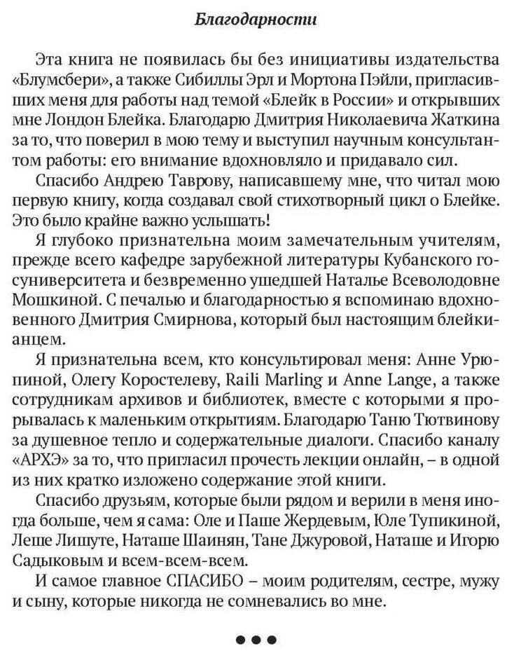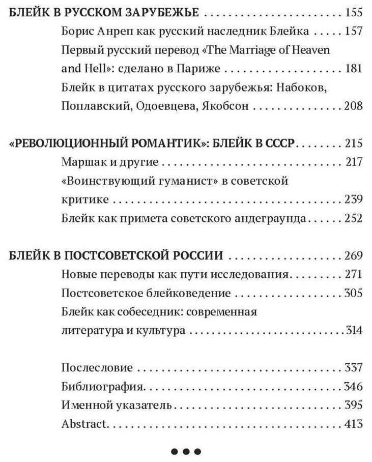 Автор описывает палитру переводческих стратегий в переложении Блейка на русский с 1834 до 2020 года. Здесь можно прочесть забытые переводы Владимира Эльснера (Киев, 1912), а также впервые открытые переводы из Блейка Николая Гумилева (Петербург, 1919–1921) и Серафимы Ремизовой (Париж, 1920–1930-е). Можно больше узнать о поэте и художнике-мозаичисте, эмигранте Борисе Анрепе, который считал себя наследником Блейка и писал свои пророческие поэмы, многие из которых до сих пор не опубликованы.