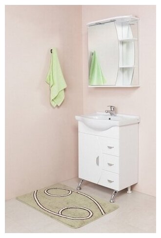 Слева за распашной зеркальной дверцей с механизмом плавного закрывания расположено вместительное отделение для хранения, разделенное на 3 части горизонтальными полочками, справа - 3 открытые полочки для косметических средств или декоративных элементов.