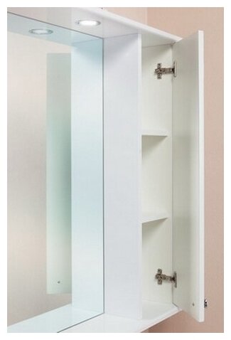 Современный функционал шкафа позволяет удобно расположить все необходимое: справа от зеркала за распашной дверцей с механизмом плавного закрывания расположено отделение для хранения, разделенное на три части горизонтальными полочками, слева и внизу под зеркалом - открытые полочки для косметических средств или декоративных элементов.