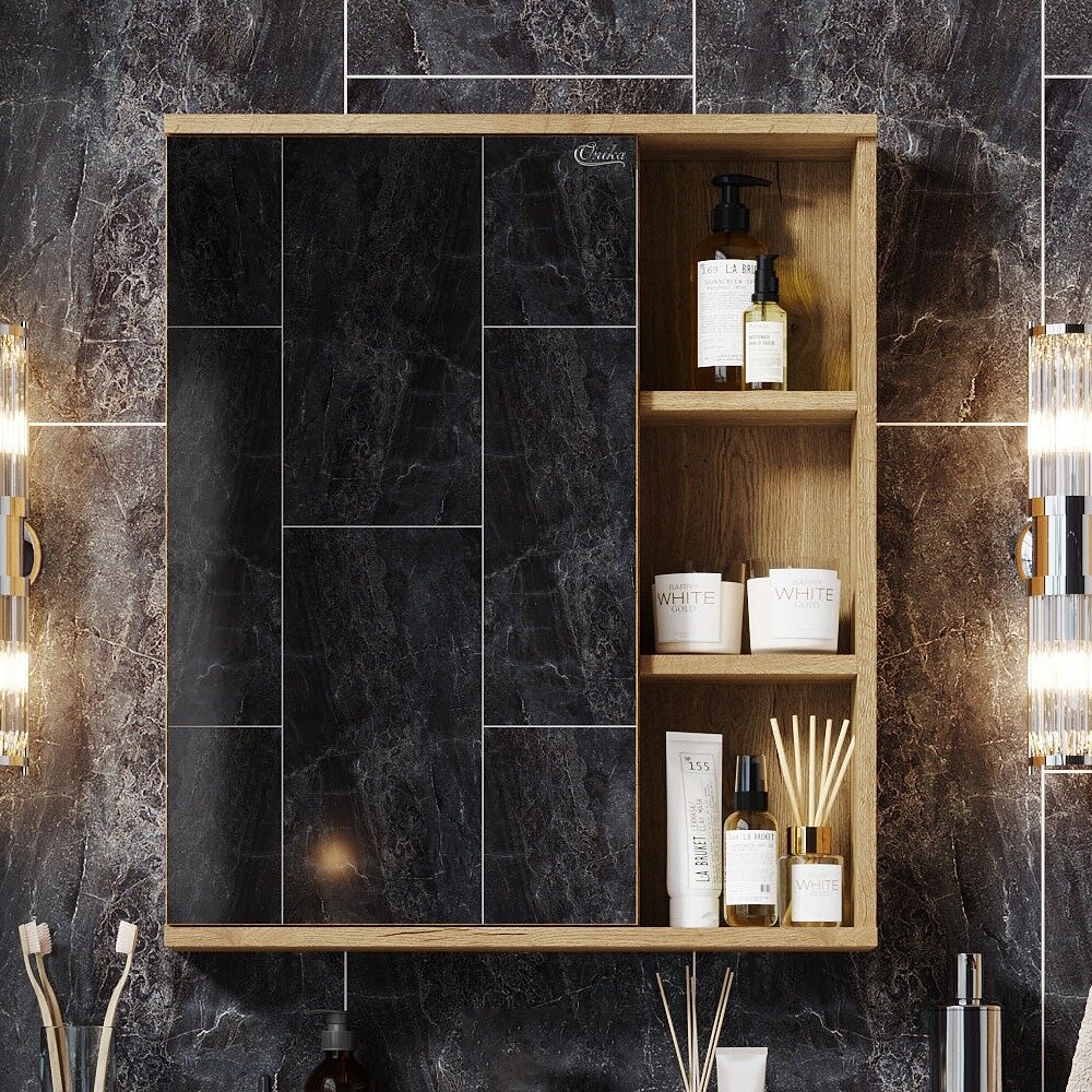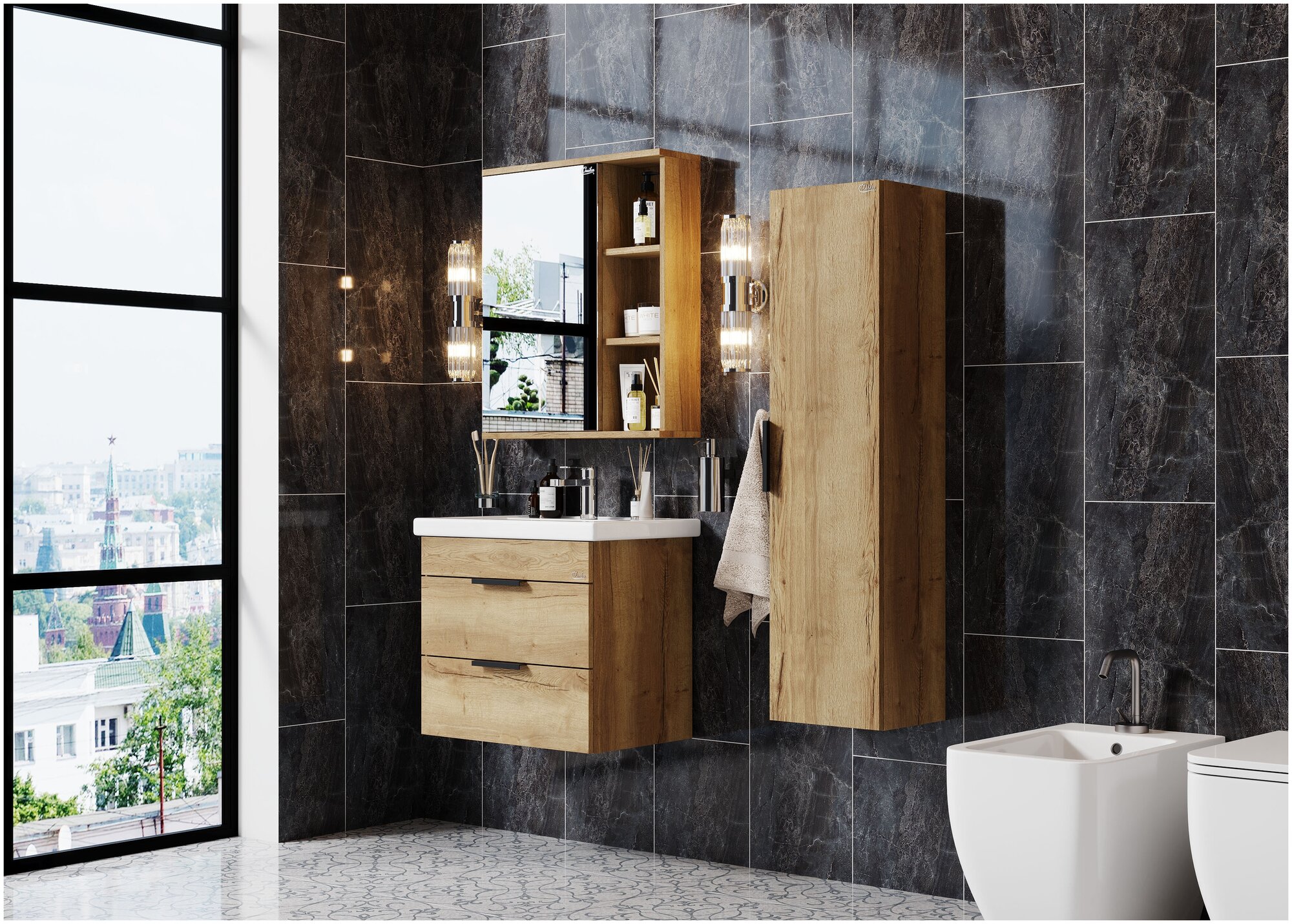 Зеркальный шкаф Onika ЛЕГРАН 60.00У - это сочетание насыщенного древесного декора и благородства металла: роскошная текстура и натуральный цвет дуба дают теплоту, а матовая металлическая ручка добавляет урбанизма и солидности.