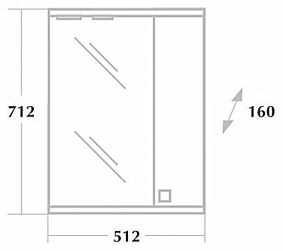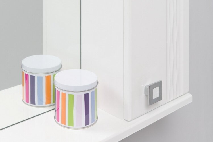 Справа от зеркала за распашной дверцей с механизмом плавного закрывания расположено отделение для хранения, разделенное на две части горизонтальной полочкой, под зеркалом - открытая полочка для косметических средств или декоративных элементов.