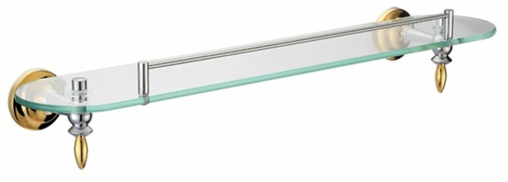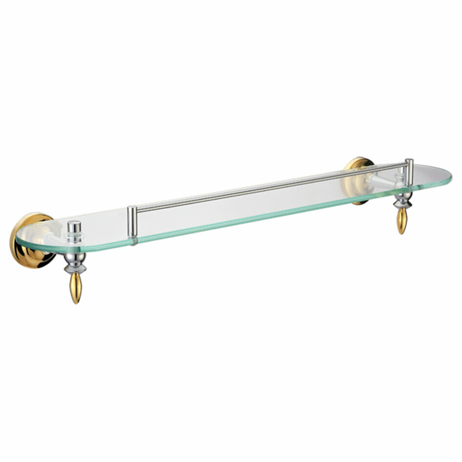 Стеклянная полка выполнена из закаленного стекла толщиной 7мм. Полка безопасна. Разбить ее сложно, но если так произошло, то осколки будут иметь тупые грани, которые не причинят серьезных травм. Основа полки выполнена из латуни, устойчивой к коррозии. Поверхность золотистого цвета добавит роскоши любому интерьеру ванной комнаты.