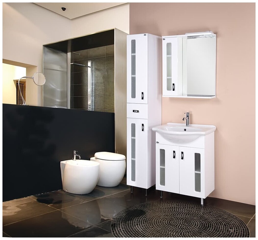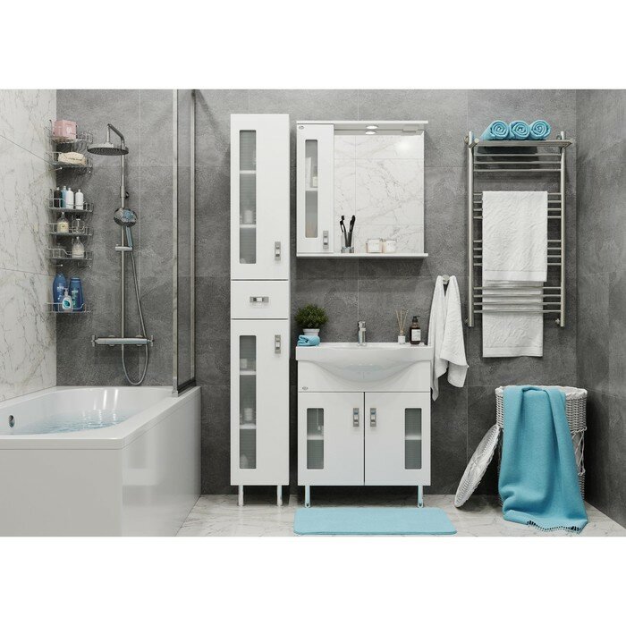 Белоснежный цвет фасада в сочетании со вставками из матового стекла и хромированными ручками необычной формы придадут ванной комнате ощущение свежести, чистоты и уюта.