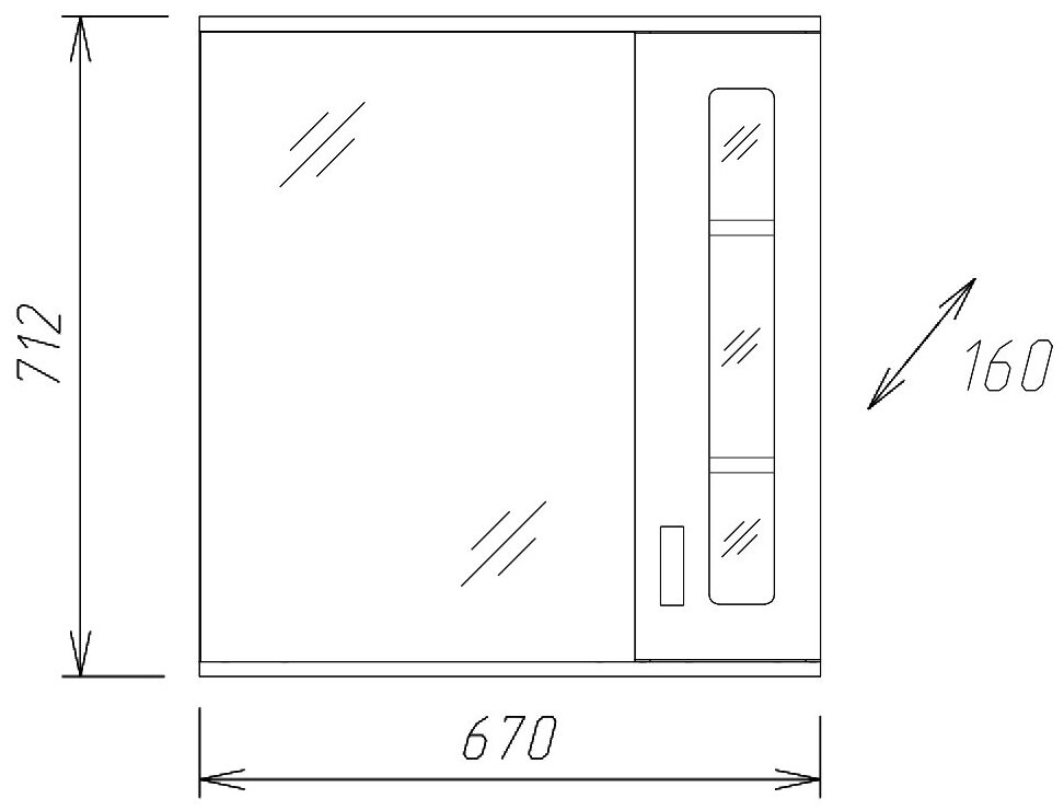 Слева от зеркала за распашной дверцей с механизмом плавного закрывания расположено отделение для хранения, разделенное двумя горизонтальными полочками, под зеркалом - открытая полочка для косметических средств или декоративных элементов.