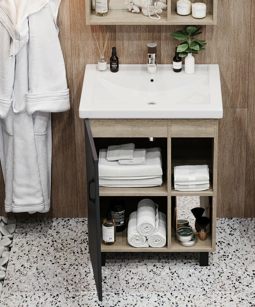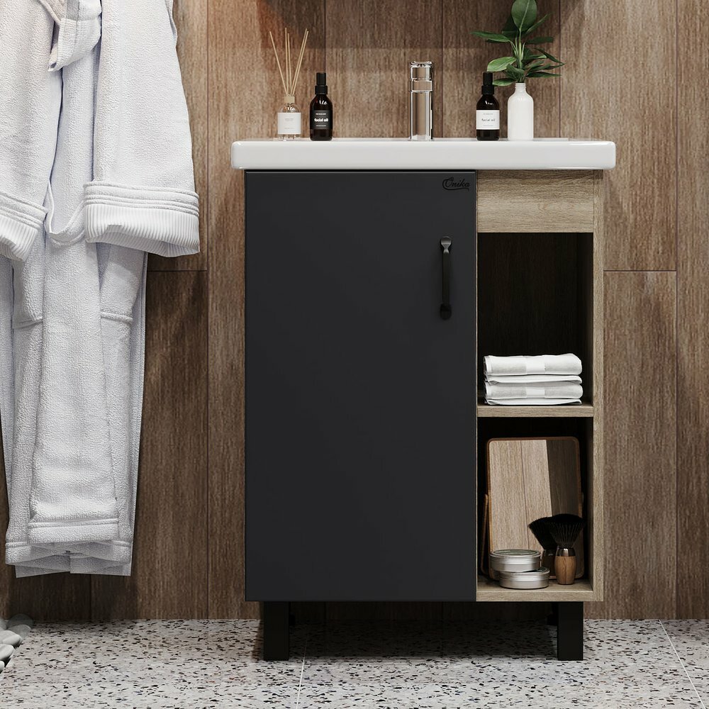 В тумбе Onika ТИМБЕР 60.01 удачно сочетаются контрастные цвета и фактуры: серый матовый фасад с покрытием SoftTouch, корпус цвета дуба с роскошной текстурой, черная матовая металлическая фурнитура.