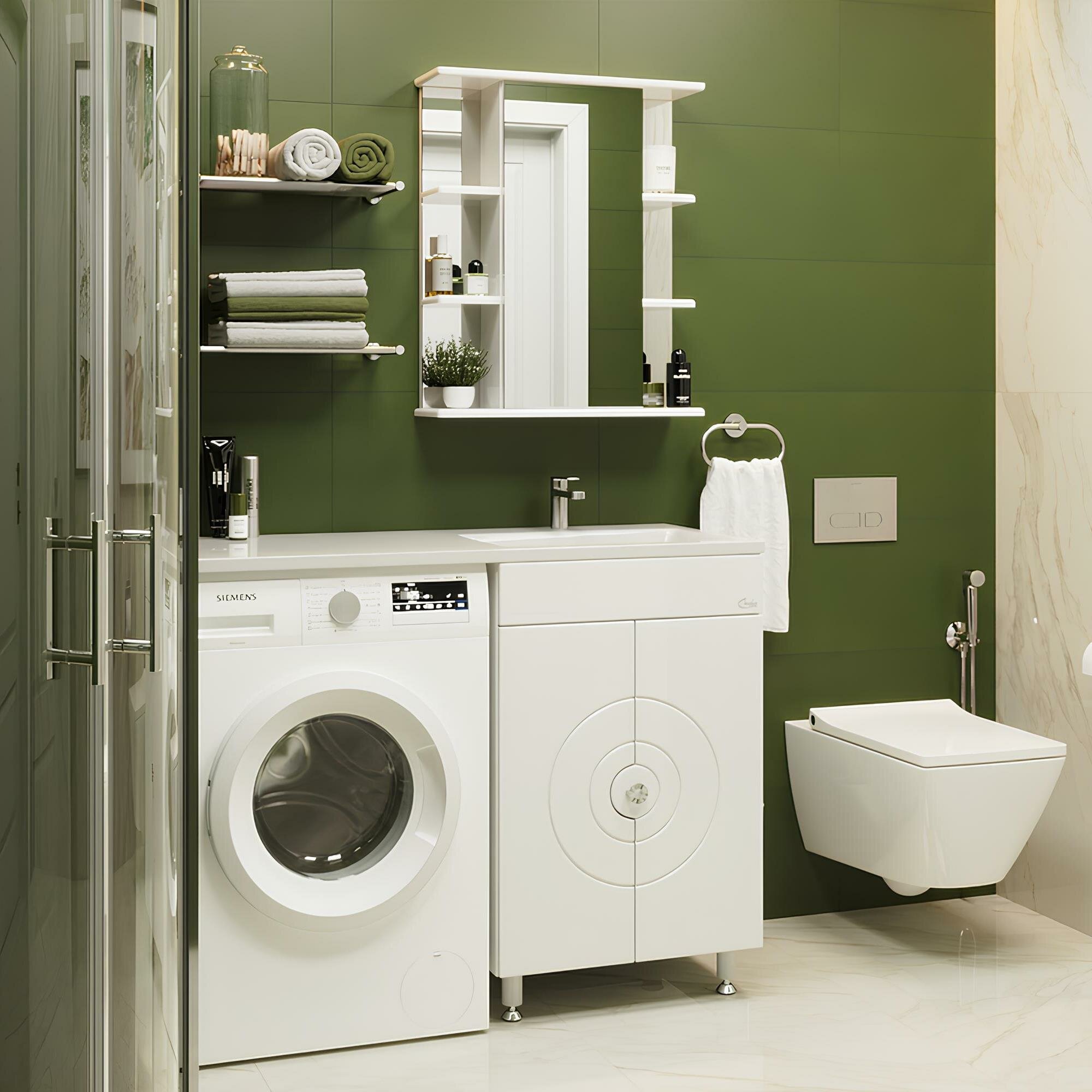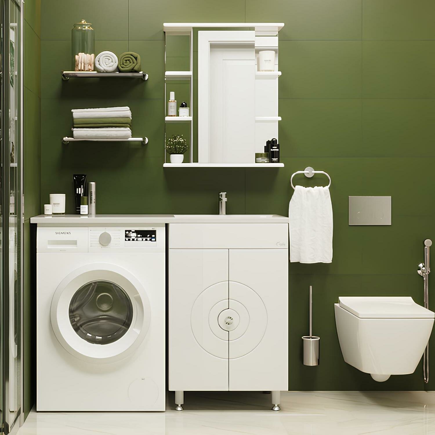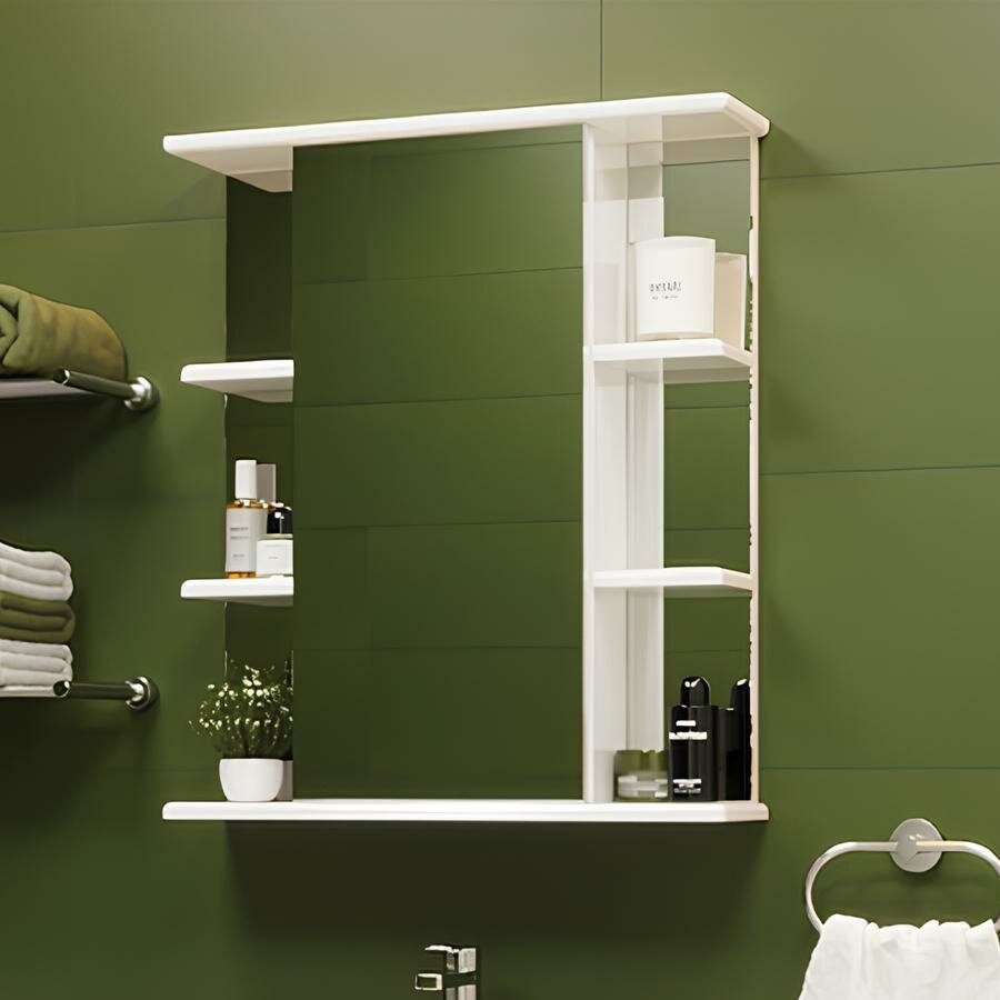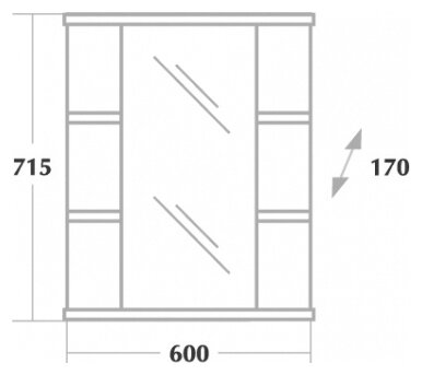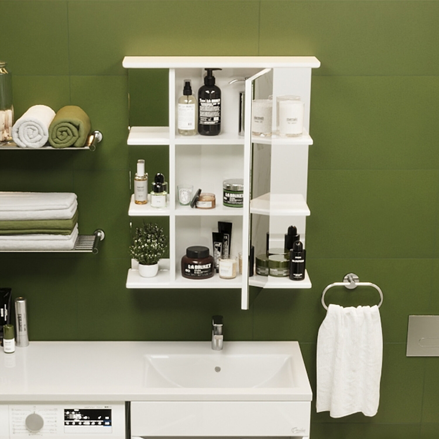 В центре шкафа - зеркальная дверца с механизмом плавного закрывания, за которой скрывается отделение для хранения, разделенное на две части горизонтальной полочкой. По бокам - открытые полочки для косметических средств или декоративных элементов.