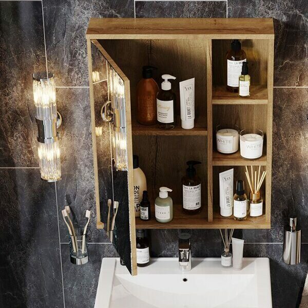 Открытая полка обеспечивает быстрый доступ к часто используемым аксессуарам, а пространство за распашной зеркальной дверцей с механизмом плавного закрывания, разделенное полочкой, станет удобным местом для хранения различных бытовых принадлежностей.