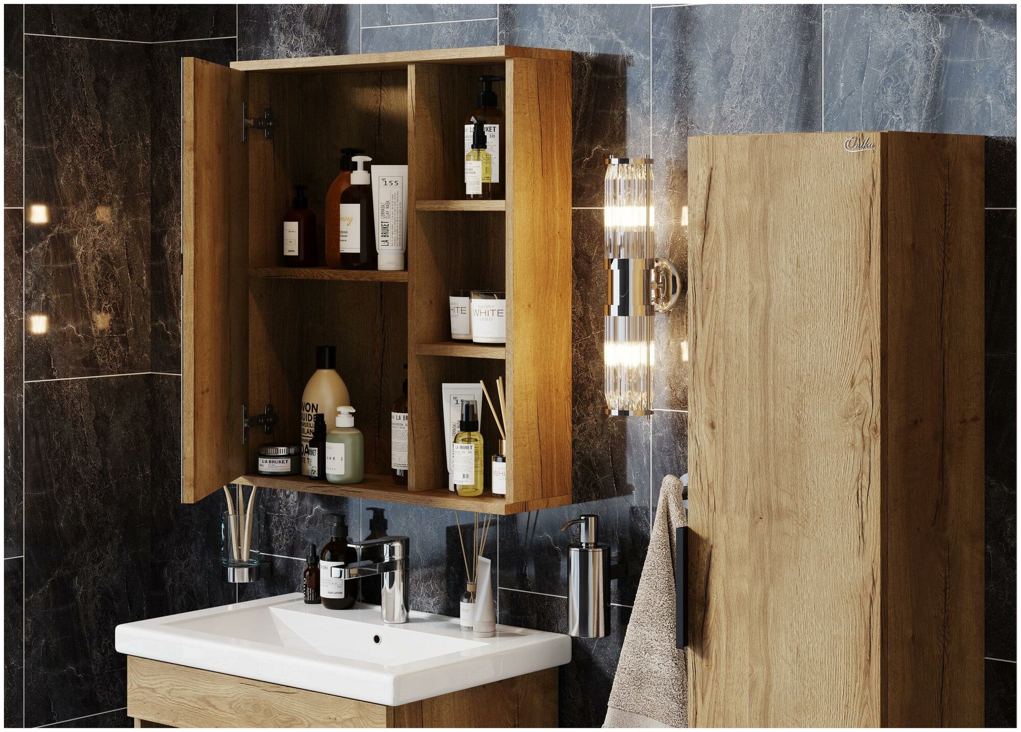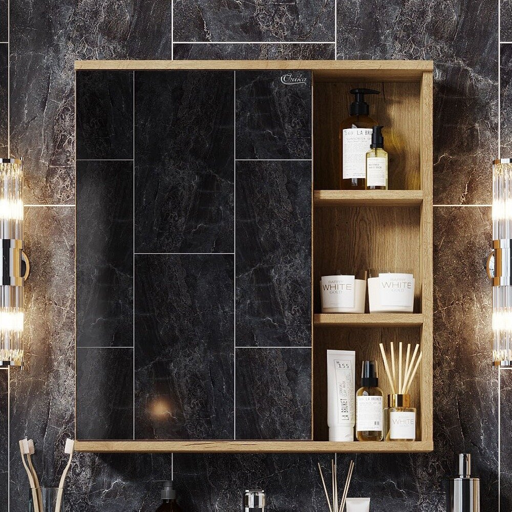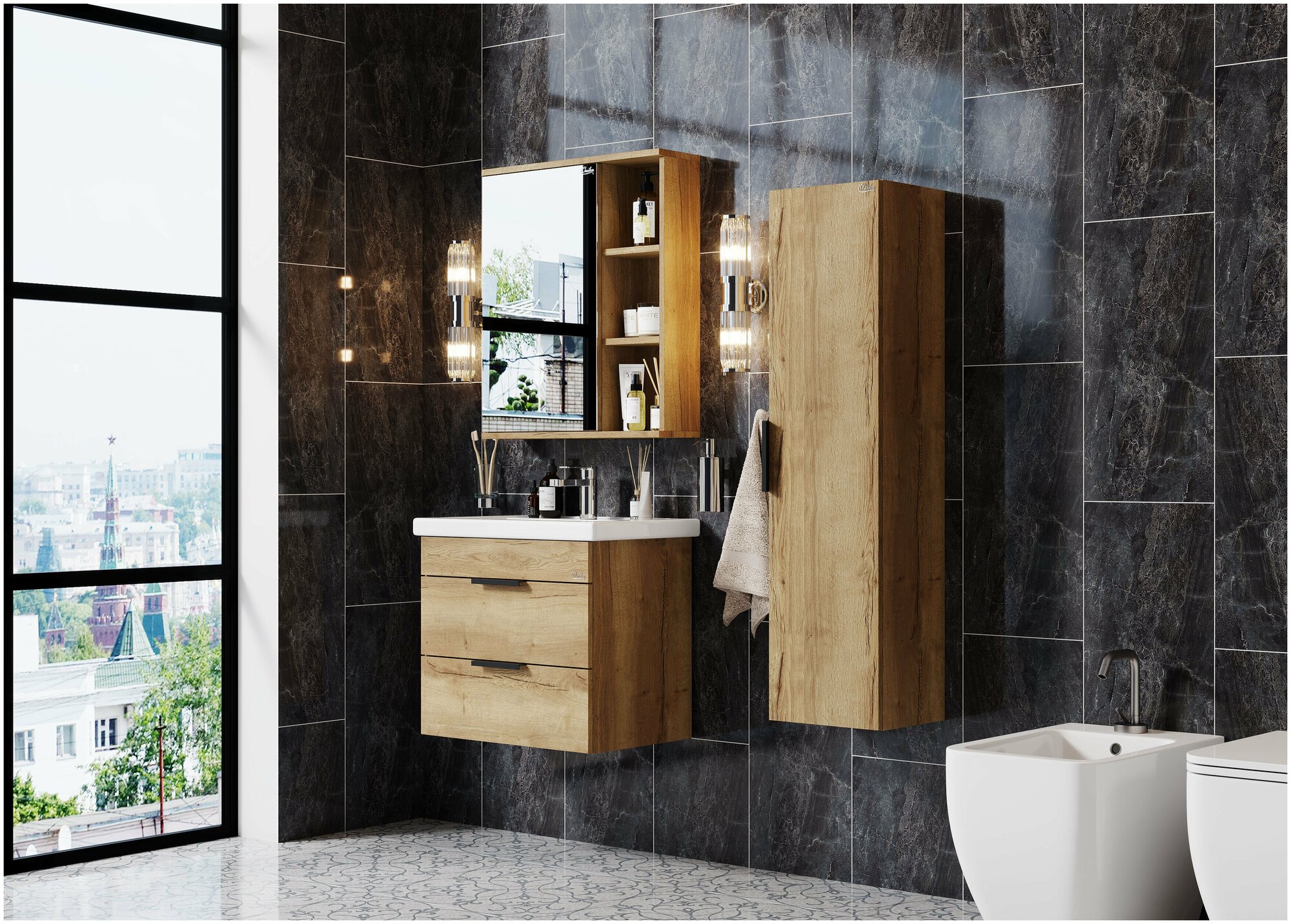 Зеркальный шкаф Onika ЛЕГРАН 70.00У - это сочетание насыщенного древесного декора и благородства металла: роскошная текстура и натуральный цвет дуба дают теплоту, а матовая металлическая ручка добавляет урбанизма и солидности.