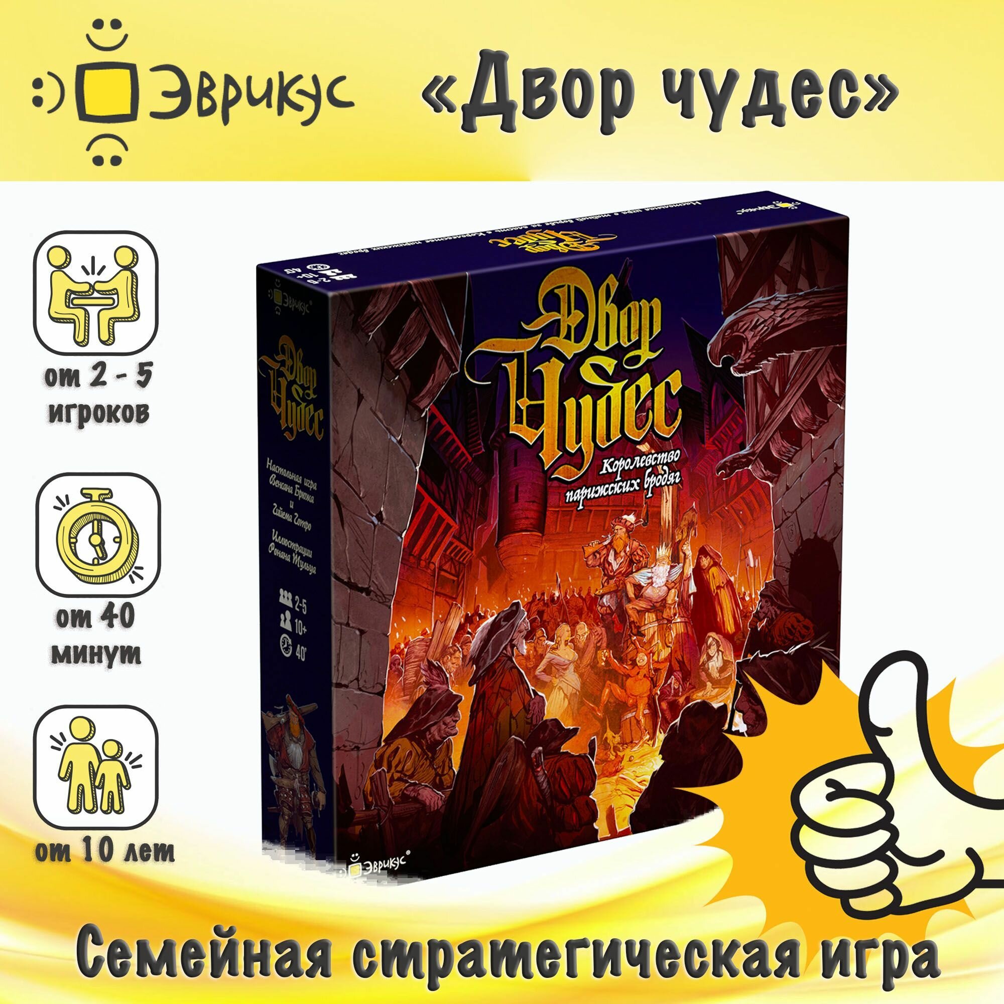 «Двор чудес» — семейная стратегическая игра. Игроки возглавляют одну из гильдий нищих и начинают борьбу за власть и славу. Их цель — расставить 6 жетонов славы. Установить контроль над кварталами Парижа игрокам помогут карты интриг, деньги и сила их приспешников. Историческая тема, игровое поле в виде карты Парижа, большое количество качественных компонентов, прекрасные иллюстрации — всё это помогает ощутить атмосферу игровой истории.
