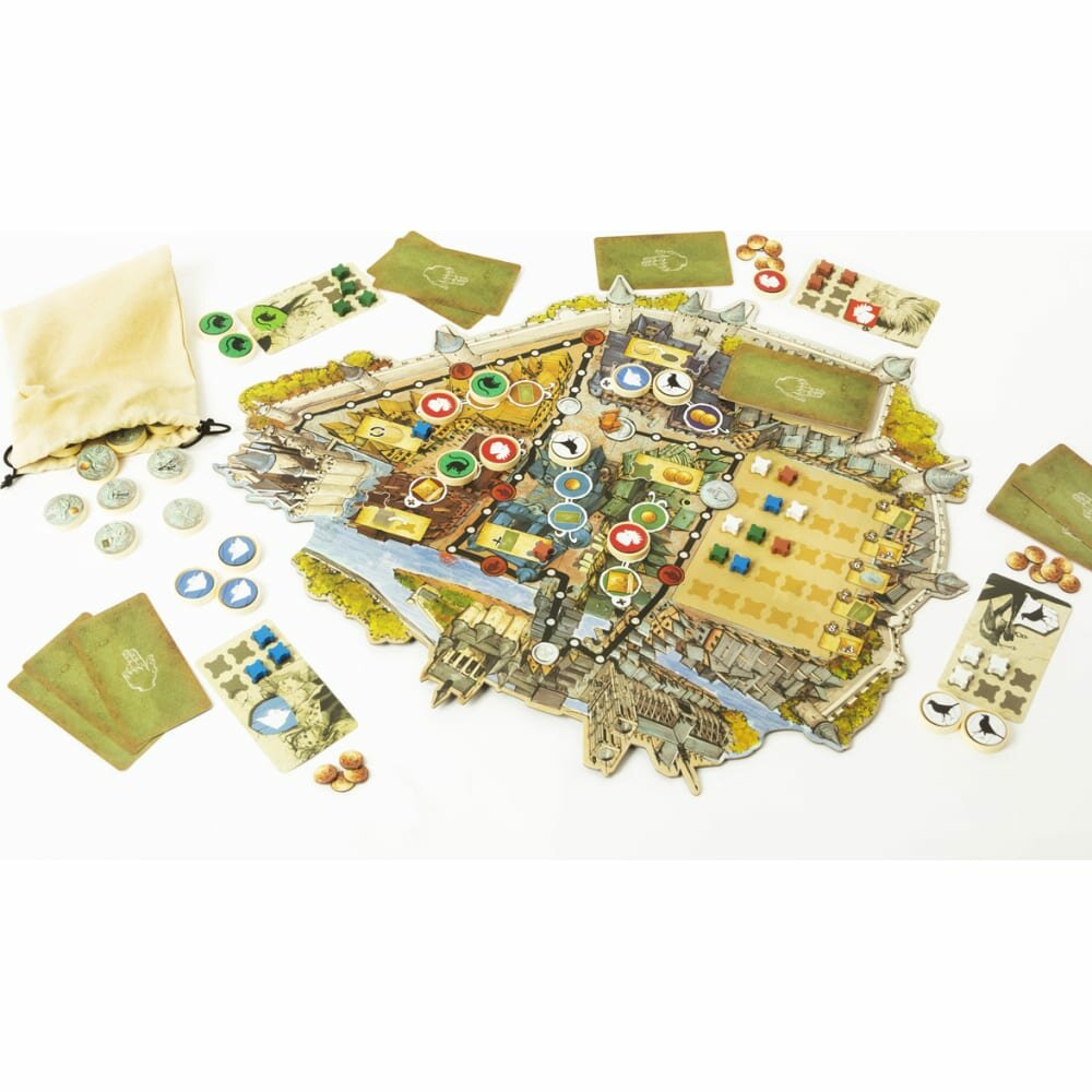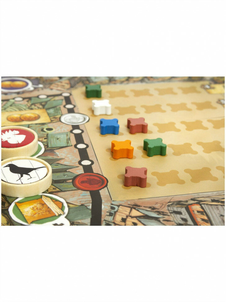 - Большое количество деревянных компонентов, игровое поле с фигурным контуром, прекрасные иллюстрации.