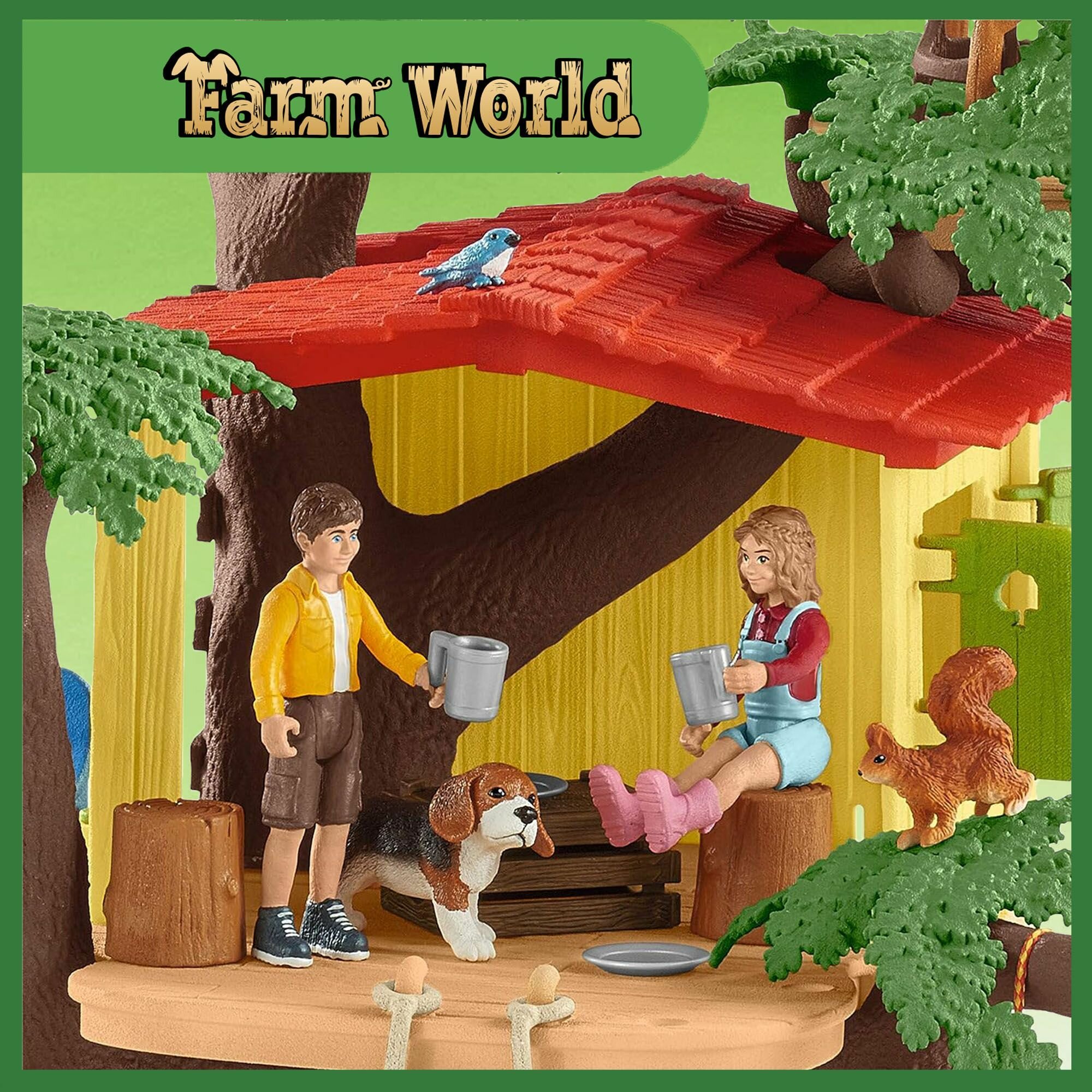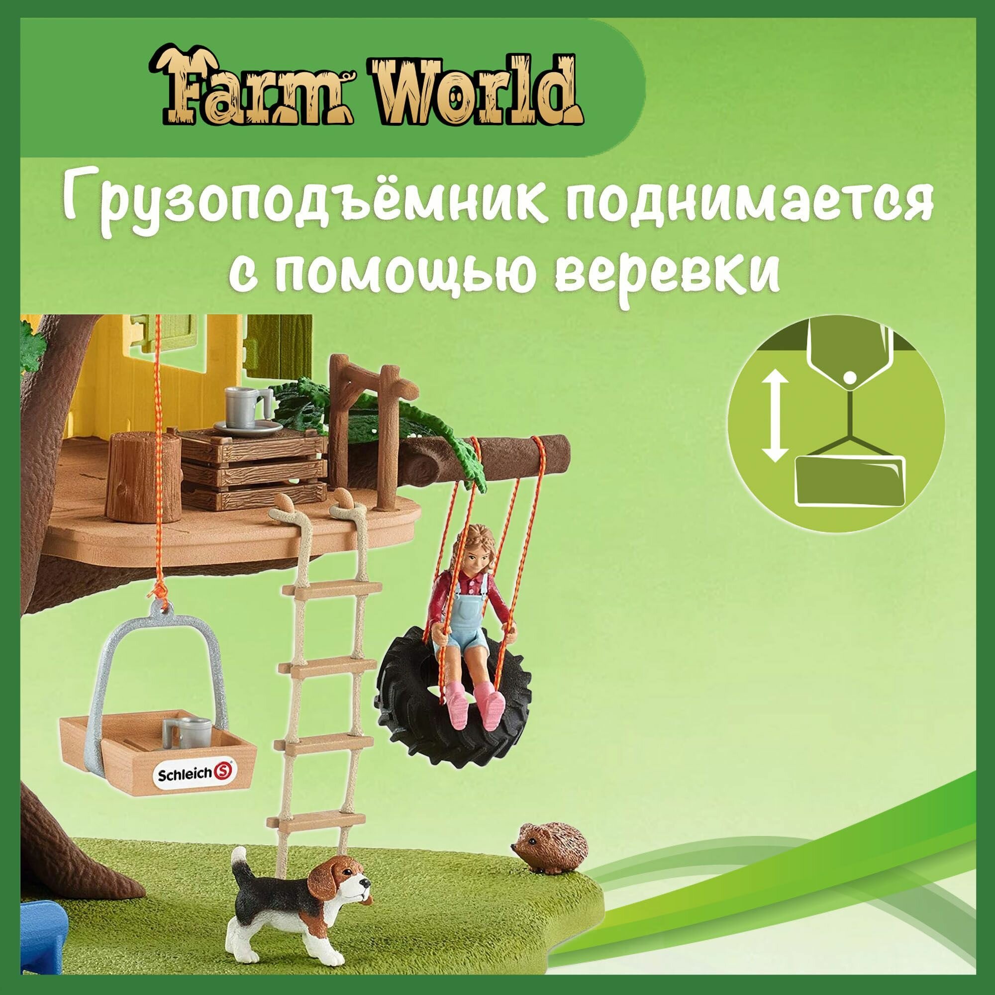 С помощью тали сладкого щенка бигля можно легко поднять в уютный домик на дереве. Все могут играть вместе. В дупле ствола дерева имеет также свой собственный дом еж, а маленькая птичка чувствует себя владелицей собственной империи в листве. С 2 фигурками людей, 4 животными и превосходных аксессуарами.