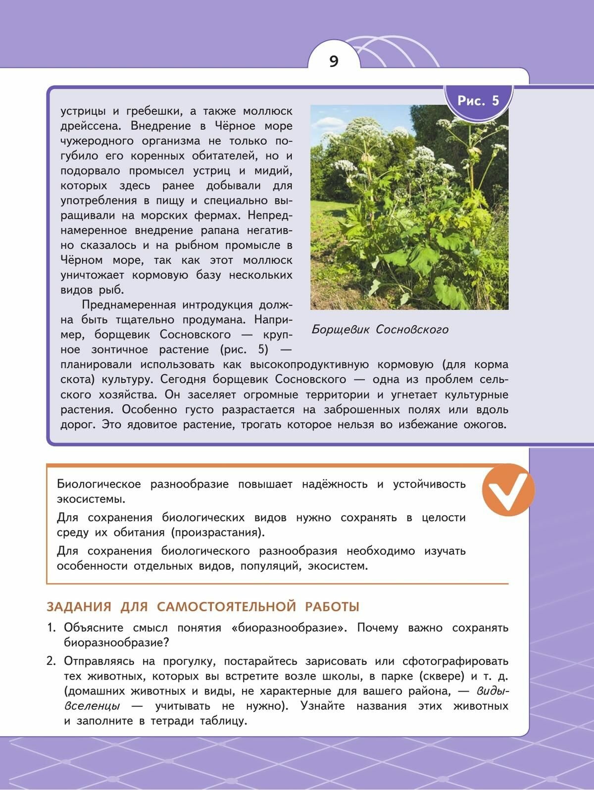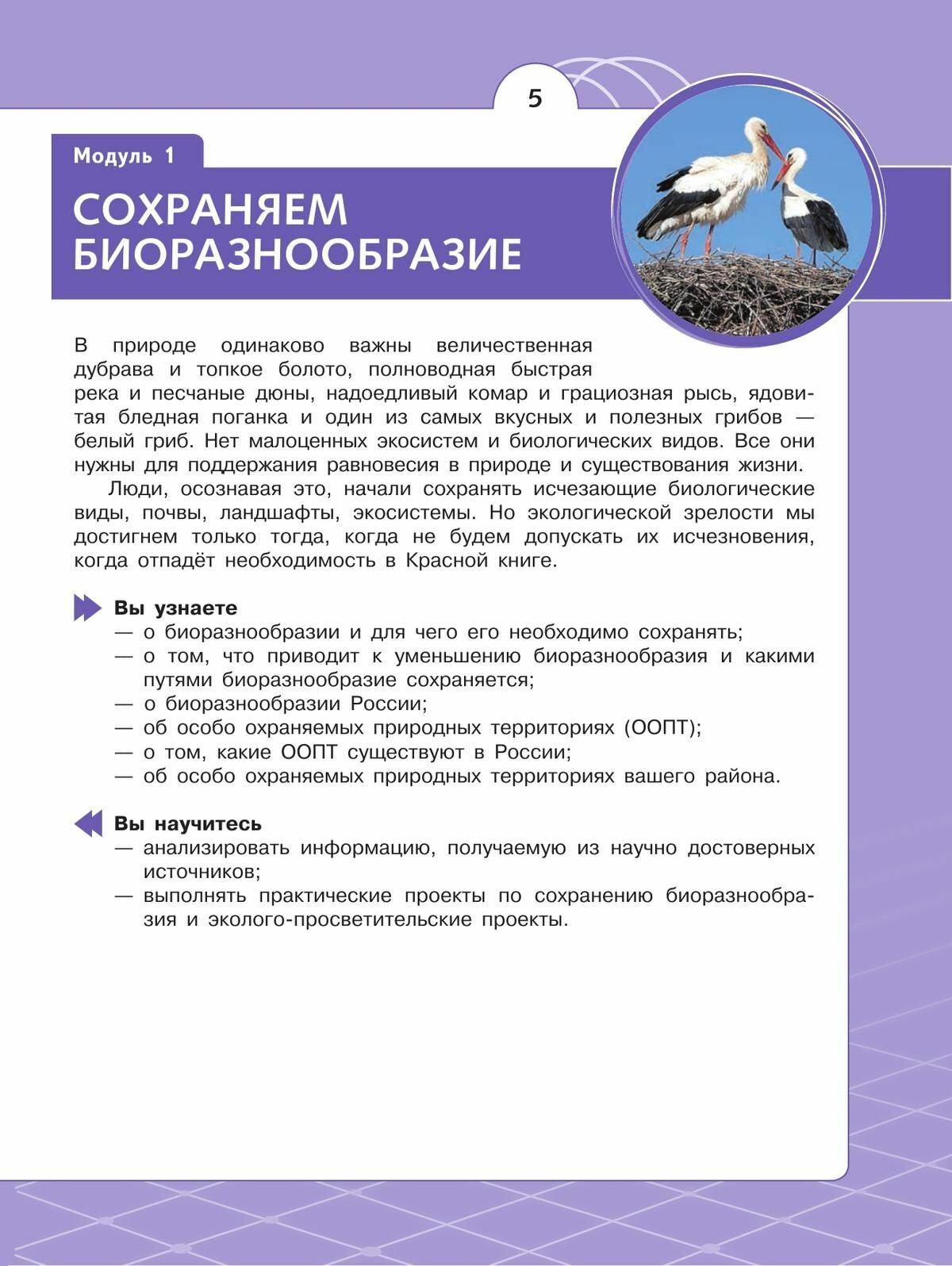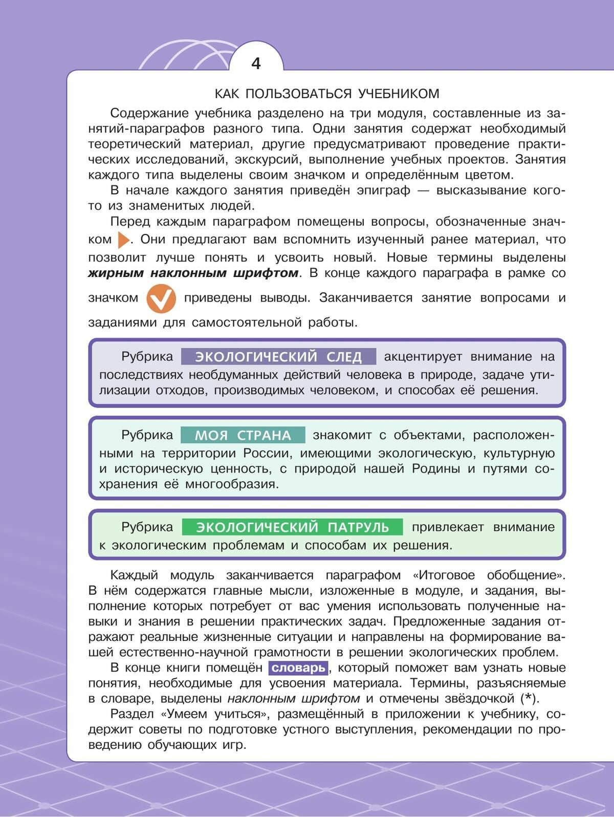 Учебный материал, приведённый в учебнике, с одной стороны, опирается на полученные ранее знания обучающихся, с другой стороны, значительно расширяет кругозор школьников по каждой теме; содержание учебника обеспечивает сопровождение образовательной деятельности учащихся в разных формах: практической работы, учебном проекте, учебном исследовании, учебной экскурсии. Обобщение знаний происходит при выполнении заданий на формирование функциональной грамотности обучающихся.