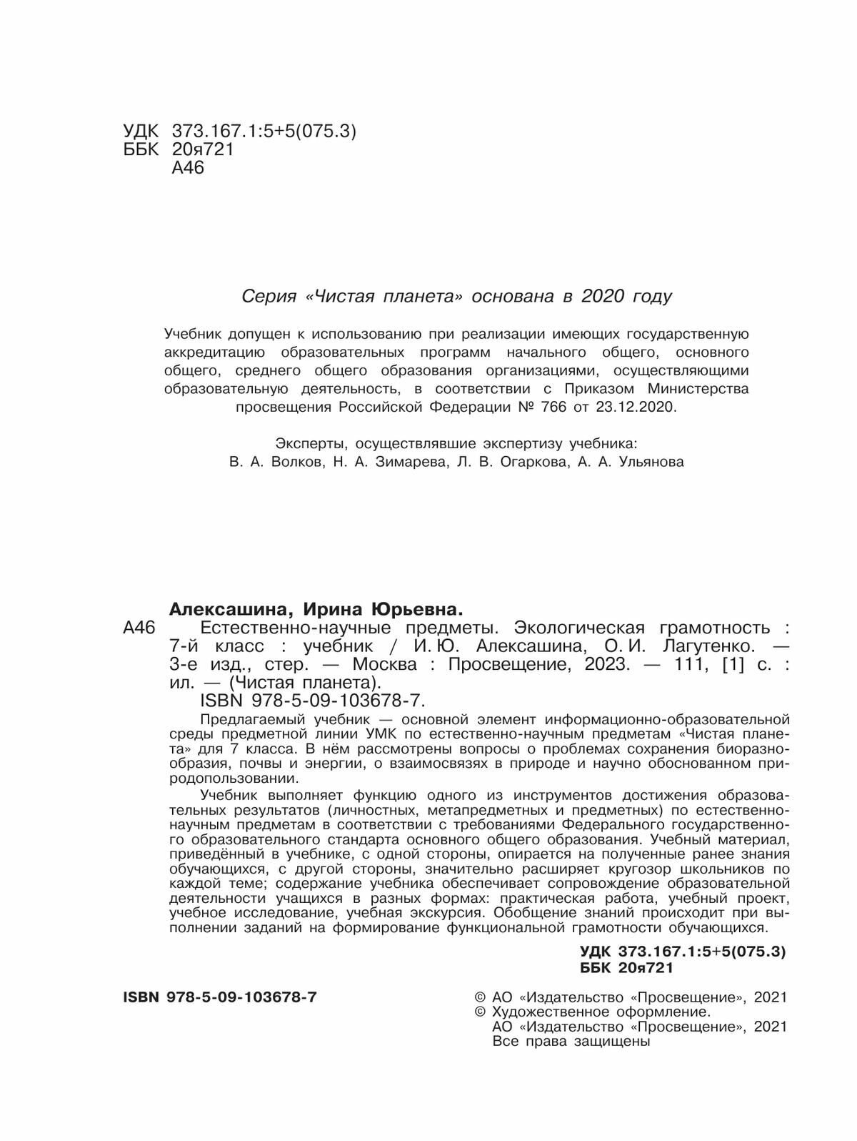 Естественно-научные предметы. Экологическая грамотность. 7 класс. Учебник (Алексашина Ирина Юрьевна, Лагутенко Ольга Игорьевна); Просвещение, 2023
