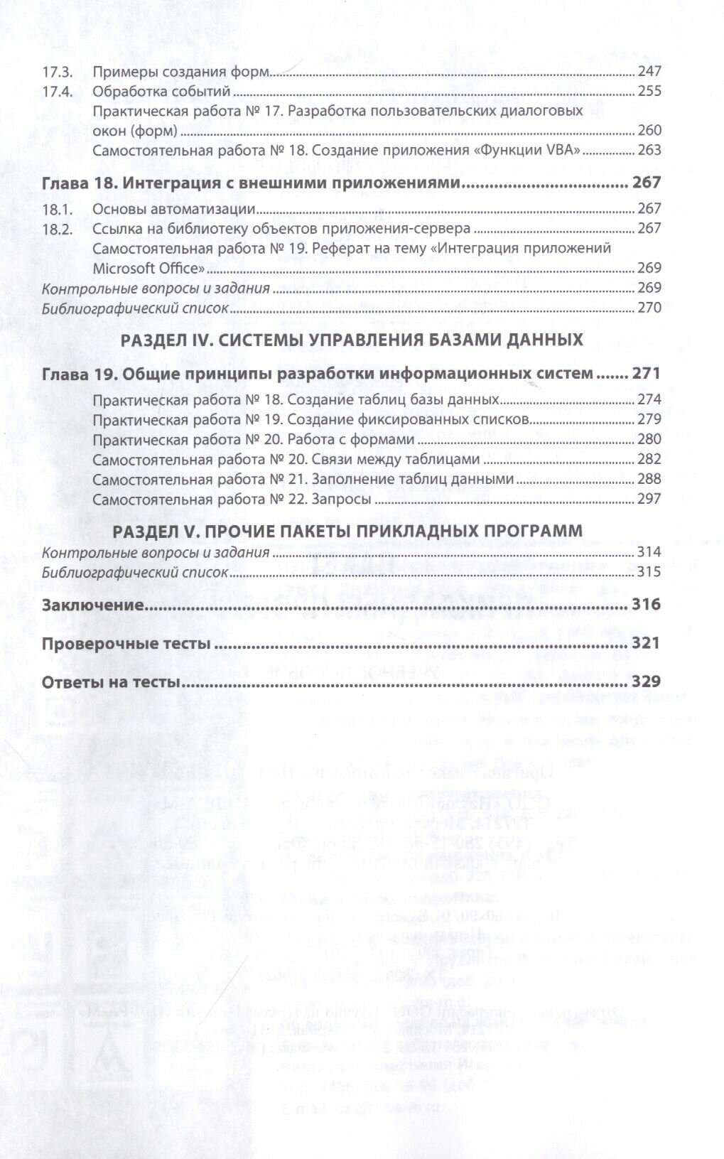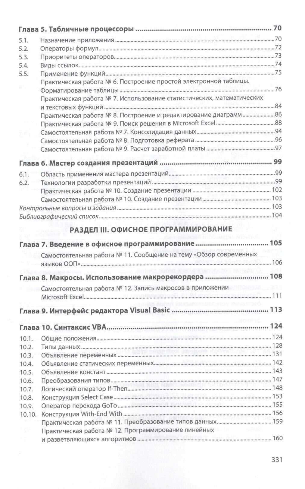 В учебном пособии описаны методы эффективной работы с прикладными программными продуктами: текстовыми редакторами, электронными таблицами, редакторами презентаций, системами управления базами данных, а также основами программирования в среде Visual Basic for Applications. Предложено более 40 практических и самостоятельных работ. Может быть использовано при освоении профессионального модуля ПМ.02 "Разработка, внедрение и адаптация отраслевого программного обеспечения" для специальности "Программирование в компьютерных системах".