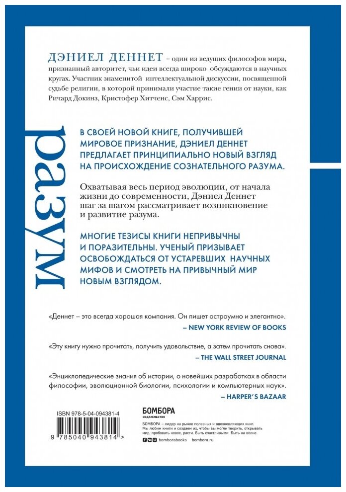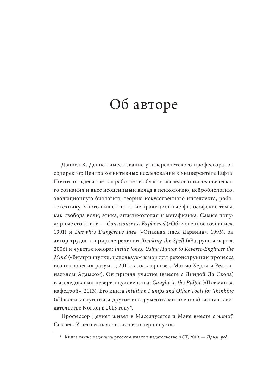 Книги знаменитого мыслителя современности Дэниела Деннета всегда вызывают споры, обсуждения, восторги и дискуссии, но никогда не остаются без внимания ученых и читателей. Исследуя сознание, разум, способность мыслить, автор отвечает на вопрос, почему именно люди, единственные из живых существ, обладают ими.