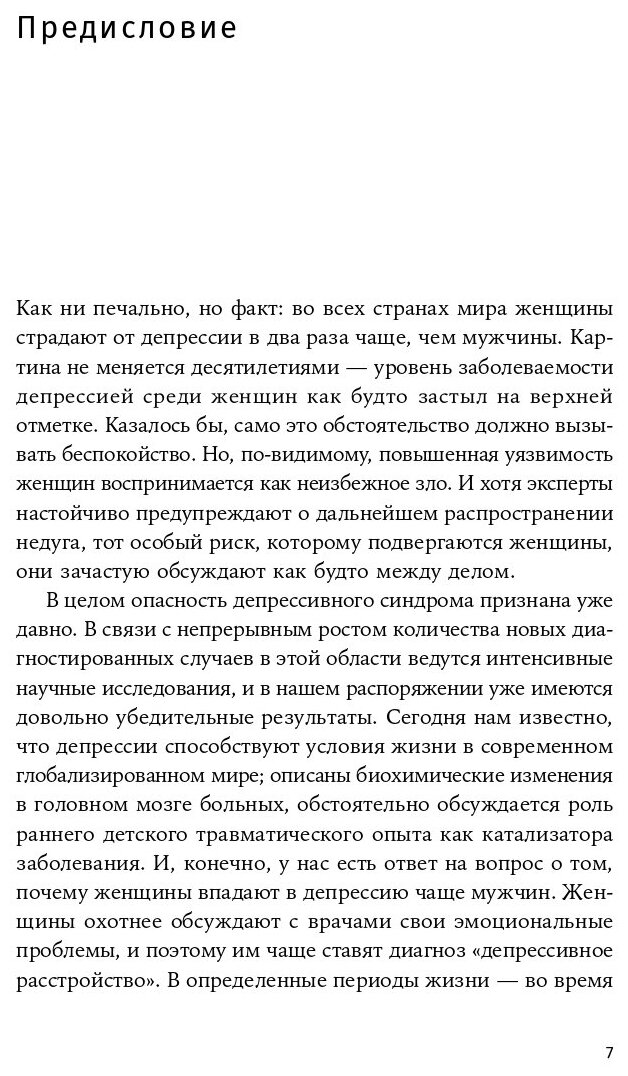 Как ни печально, но факт: во всех странах мира женщины страдают от депрессии в два раза чаще, чем мужчины. Картина не меняется десятилетиями — уровень заболеваемости депрессией среди женщин как будто застыл на верхней отметке. Казалось бы, само это обстоятельство должно вызывать беспокойство. Но, по-видимому, повышенная уязвимость женщин воспринимается как неизбежное зло. И хотя эксперты настойчиво предупреждают о дальнейшем распространении недуга, тот особый риск, которому подвергаются женщины, они зачастую обсуждают как будто между делом. Эта книга выводит тему женской депрессии на первый план и поднимает вопрос о том, какие факторы на самом деле отвечают за высокую заболеваемость депрессией среди женщин.