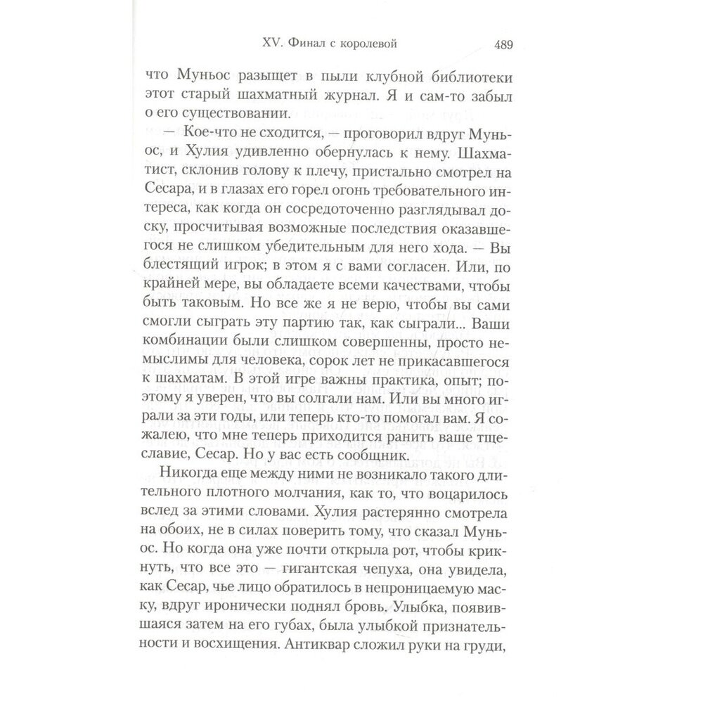 Неоконченная шахматная партия на картине фламандского художника и загадочная надпись, обнаруженная на ней под слоем краски, становятся ключом в расследовании жестоких убийств, которые происходят в наши дни. Каждый из героев романа превращается в шахматную фигуру, которая участвует в развернувшейся вокруг дьявольской игре. И безмолвная драма, отраженная в картине, получает странное продолжение спустя несколько веков. Живопись и математика, логика и история ставятся в романе на службу точному, идеально проработанному сюжету из мира коллекционеров и антикваров. Действие уводит героев в прошлое и заставляет обнаружить, что время не властно над человеческими страстями. И, в отличие от шахмат, в реальности «ничто не бывает только черным или белым»: добро легко обращается в зло, а жертва в палача.