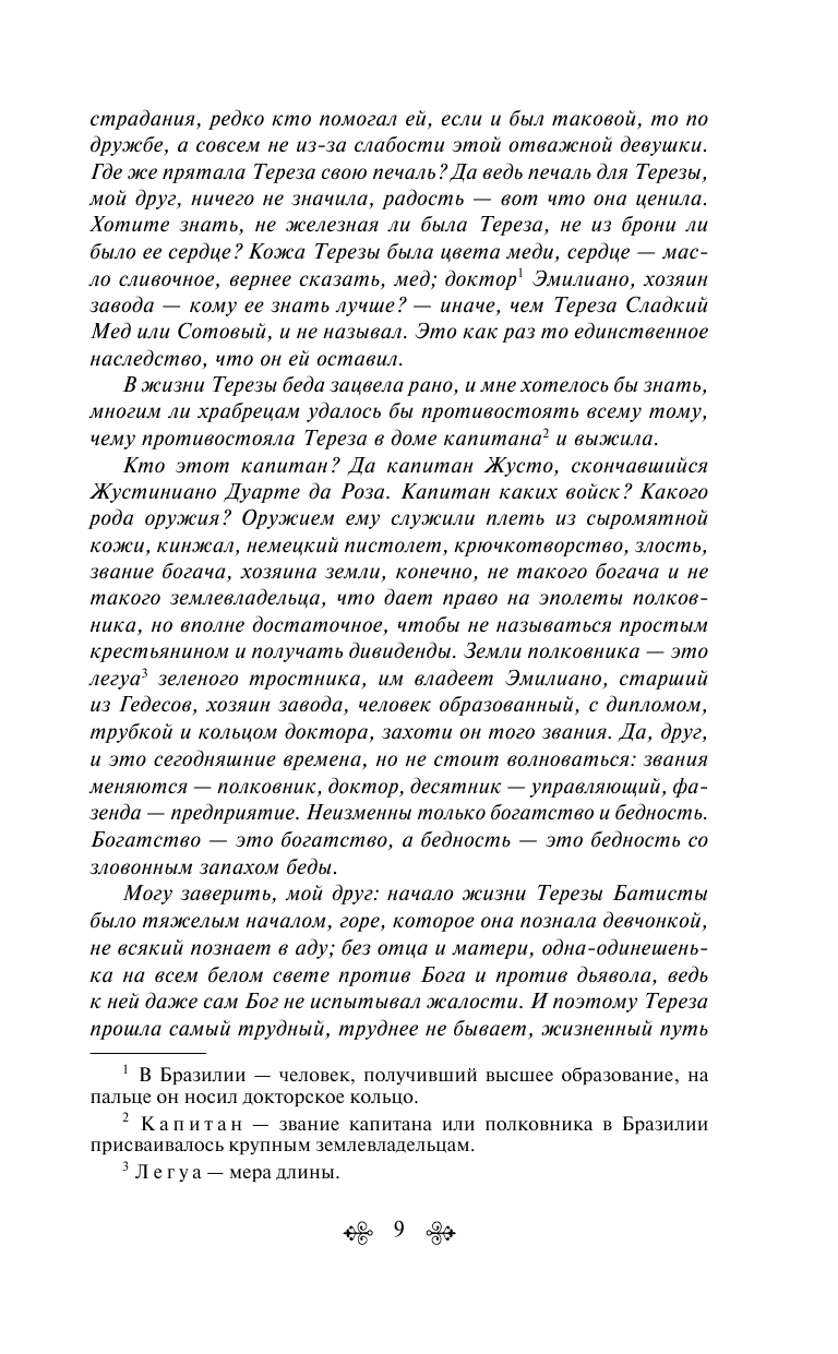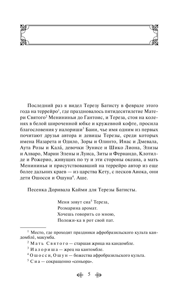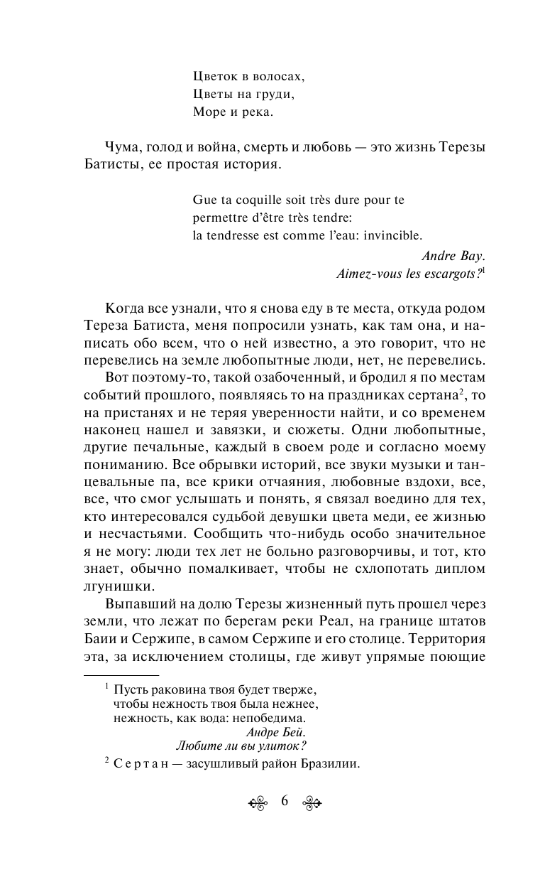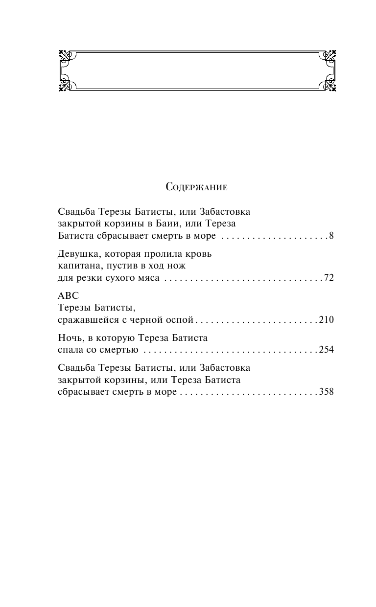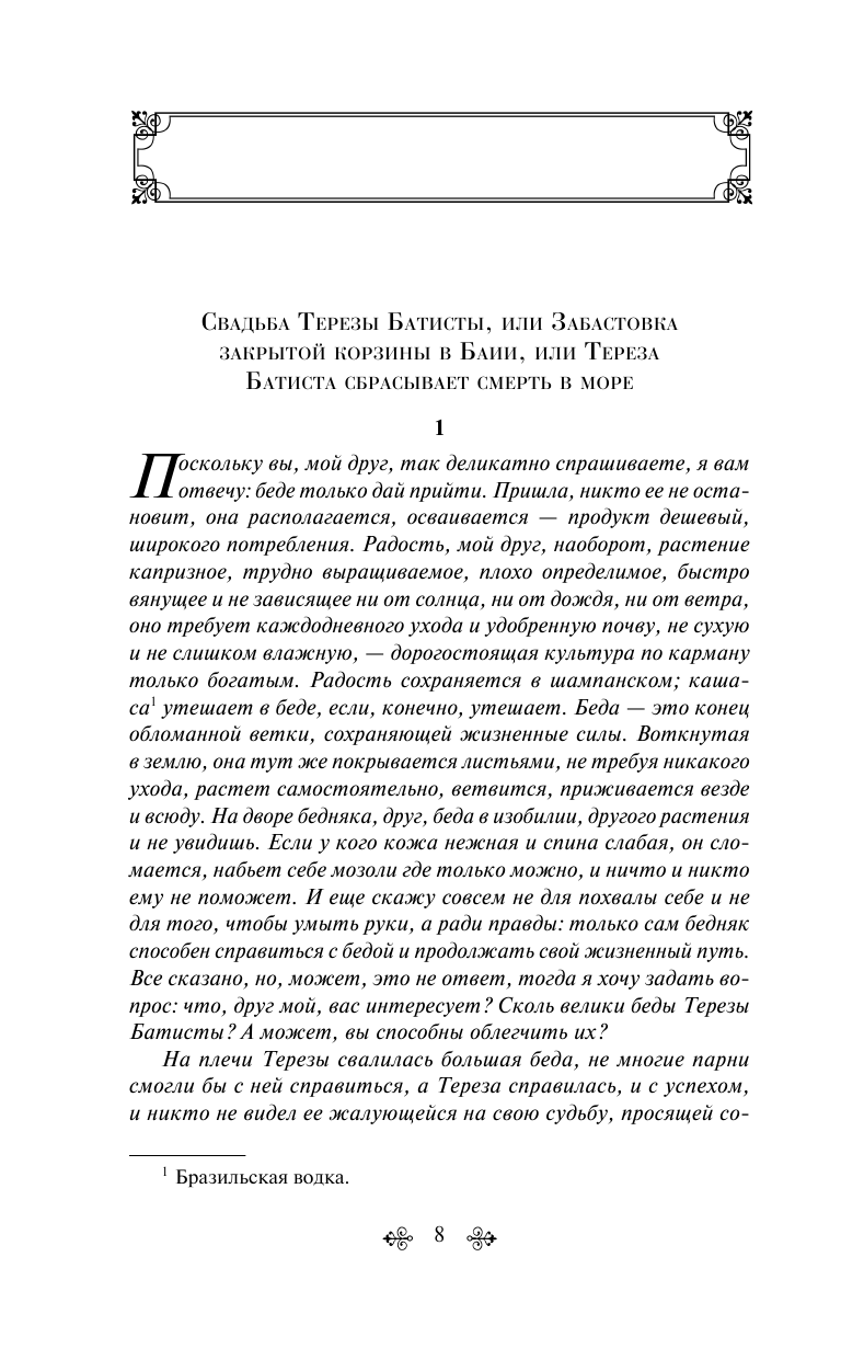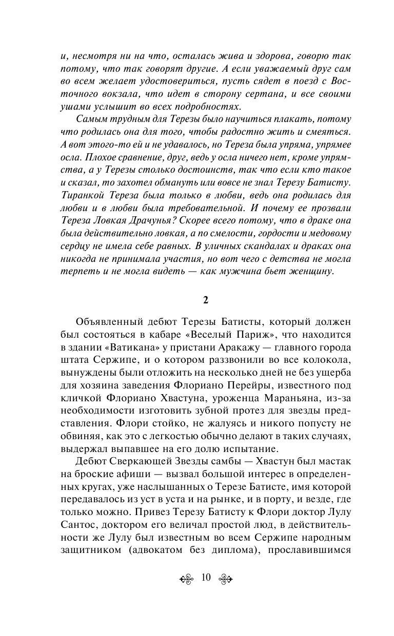 Перед нами история Терезы Батисты — сильной женщины, готовой всегда помочь, имеющей огромное доброе сердце, которая несмотря на все горести пережитого, не перестает улыбаться и верить в любовь. Автор бросает нас на амбразуру бразильской непримиримой воли к жизни, соприкасает с чудесами.