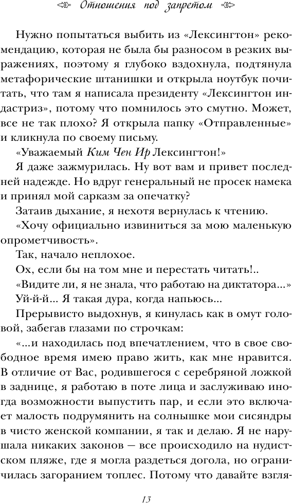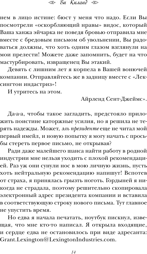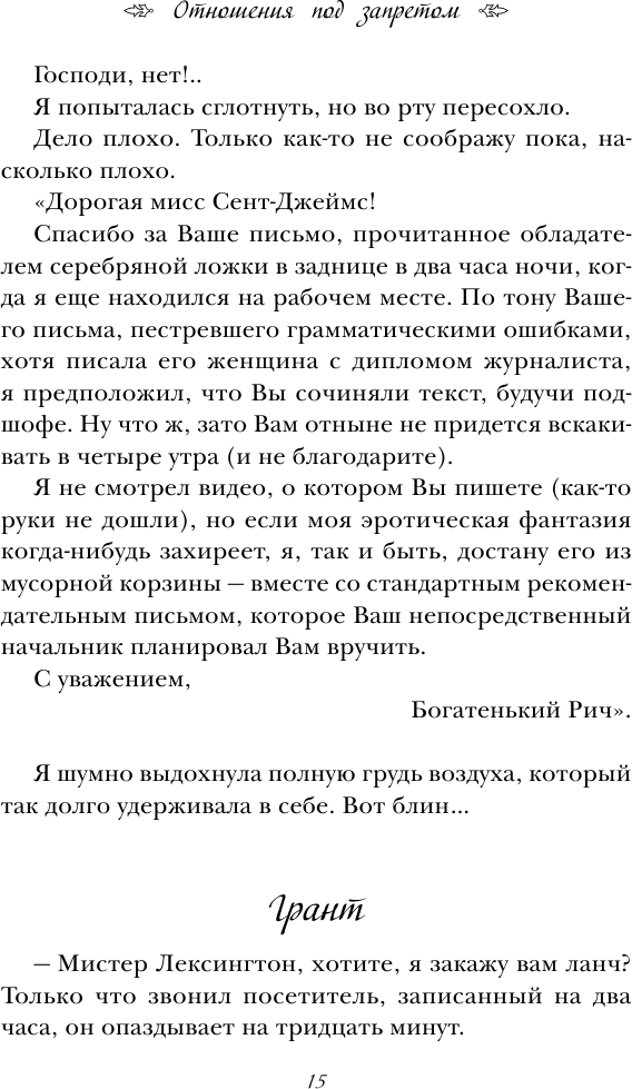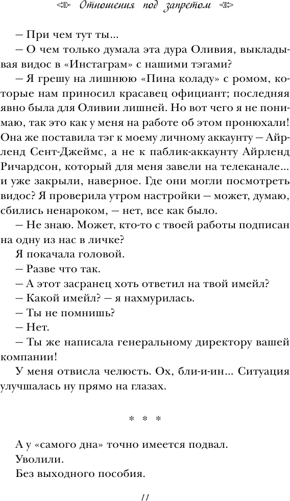 «Роман на работе – табу?» - именно эта строчка на обложке книги меня и заинтересовала. А после прочтения аннотации свято уверовала, что будет тайная интрижка на работе и множество нелепейших, но очень смешных ситуаций, в которые парочка непременно попадёт. А по факту получила шаблонный сюжет, в котором, если и присутствовали смешные моменты, то только на первых пятидесяти страницах, а потом же всё сводилось к терзаниям главных героев, и наши голубки ни от кого не скрывались, а преспокойно афишировали свой лямур. Глав.герои, к слову, получились картонными, со своими тараканами в голове и прямой, словно рельсы, и абсолютно неромантичной любовной линией. Да, у каждого из главных героев в прошлом имеется нечто, из-за чего Айрленд и Гранту вначале сложно довериться друг другу, отчего их взаимоотношения строятся только на физическом влечении. Но если страшную тайну Гранта автор открывает и даже становится понятным, почему он бежит от серьёзных отношений, как чёрт – от ладана, то почему Айрленд чурается мужиков – всем загадкам загадка.