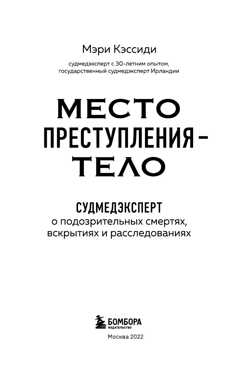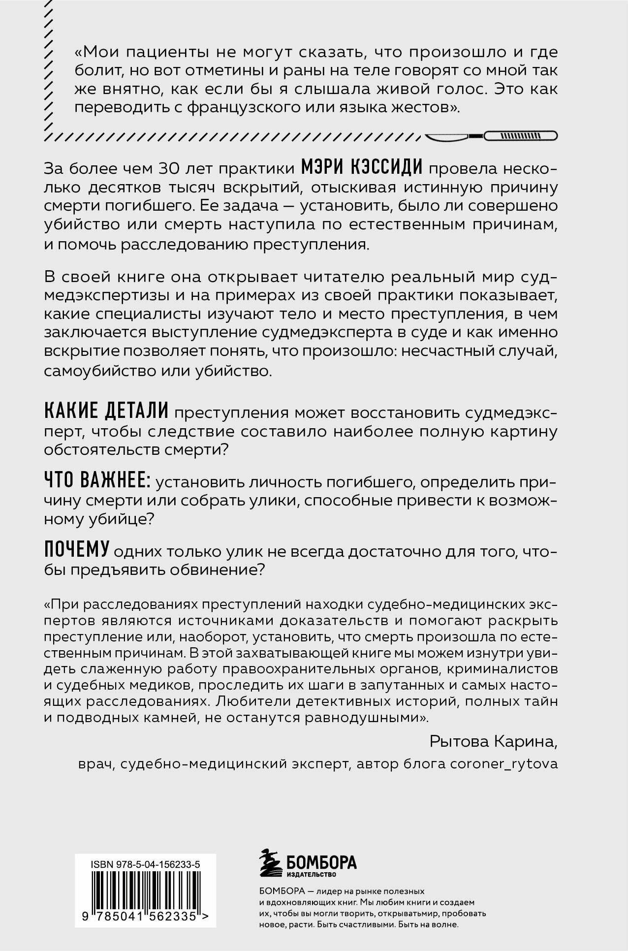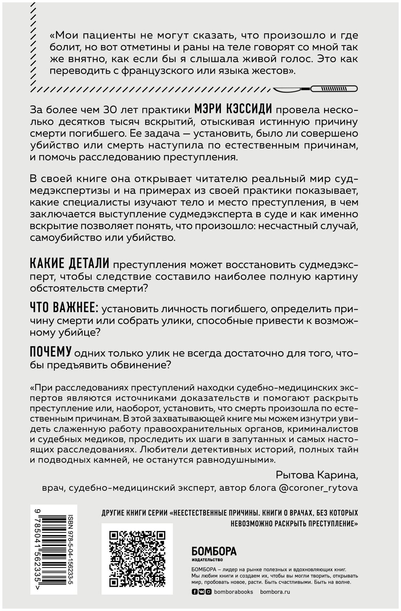 У Мэри Кэссиди простой подход к смерти: в ней нужно разобраться. И если есть доказательства того, что она была насильственной, необходимо принять меры, чтобы справедливость восторжествовала. За свою 30-летнюю практику она провела тысячи вскрытий, а также занималась установлением личности солдат из братских могил, изучала тела жертв серийных и бытовых убийств и несчастных случаев, давала показания в суде и порой сталкивалась с альтернативными версиями расследуемого случая. В этой книге она делится подробностями самых душераздирающих, загадочных и просто сложных дел, в которых участвовала, а также рассказывает об истоках судебной патологической анатомии и современных методах судмедэкспертизы.