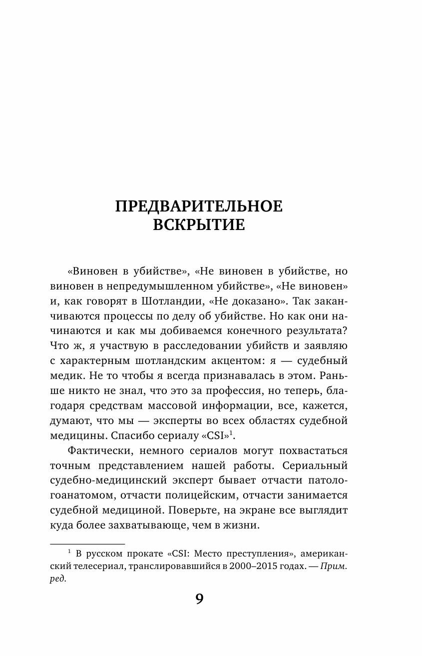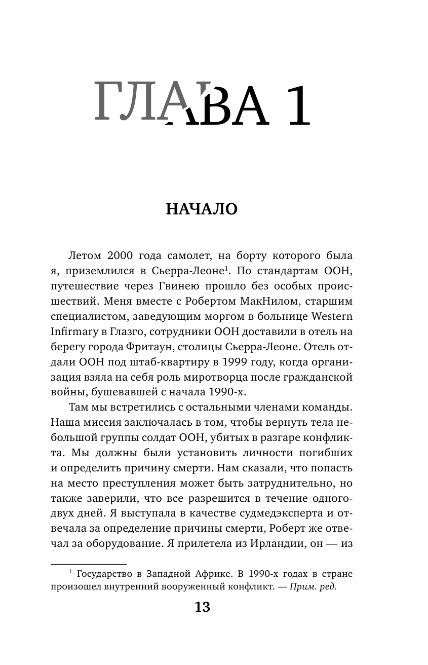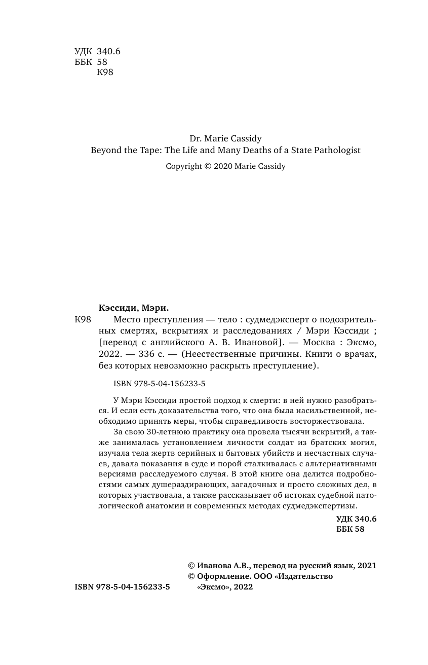 У Мэри Кэссиди простой подход к смерти: в ней нужно разобраться. И если есть доказательства того, что она была насильственной, необходимо принять меры, чтобы справедливость восторжествовала. За свою 30-летнюю практику она провела тысячи вскрытий, а также занималась установлением личности солдат из братских могил, изучала тела жертв серийных и бытовых убийств и несчастных случаев, давала показания в суде и порой сталкивалась с альтернативными версиями расследуемого случая. В этой книге она делится подробностями самых душераздирающих, загадочных и просто сложных дел, в которых участвовала, а также рассказывает об истоках судебной патологической анатомии и современных методах судмедэкспертизы.