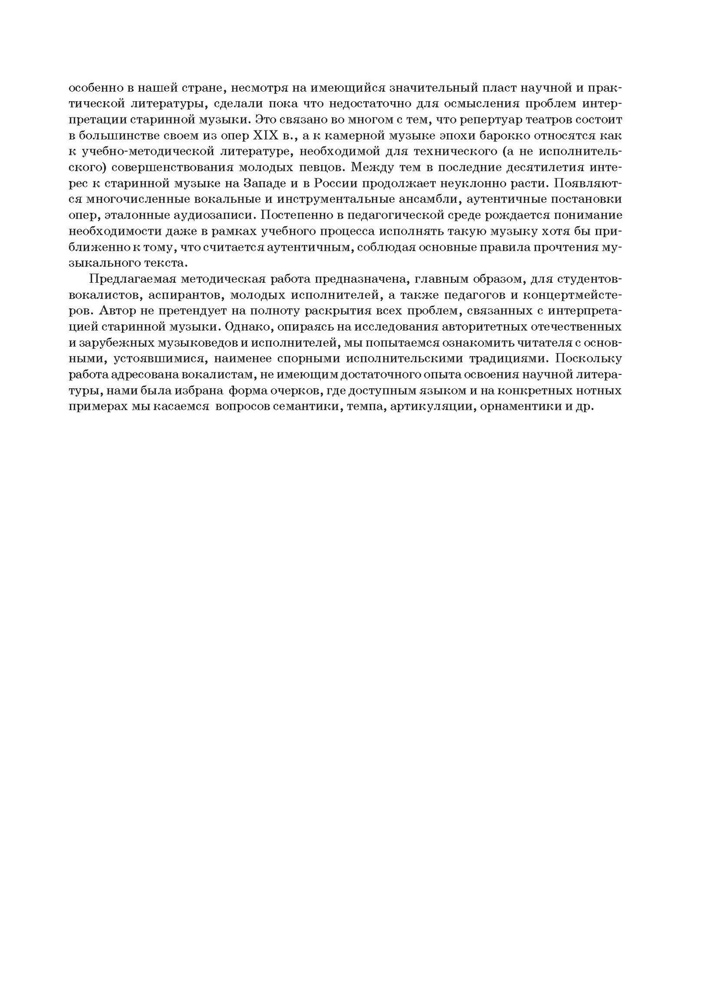 Опираясь на исследования авторитетных отечественных и зарубежных музыковедов и исполнителей, автор знакомит читателя с основными, устоявшимися, наименее спорными исполнительскими традициями. Доступным языком, на конкретных нотных примерах рассматриваются вопросы семантики, темпа, артикуляции, орнаментики и др. В предлагаемый сборник вошли практически неизвестные в России арии, которые могут расширить представления молодых вокалистов о старинной музыке. Издание предназначено, главным образом, студентам-вокалистам, аспирантам, молодым исполнителям, а также педагогам и концертмейстерам.